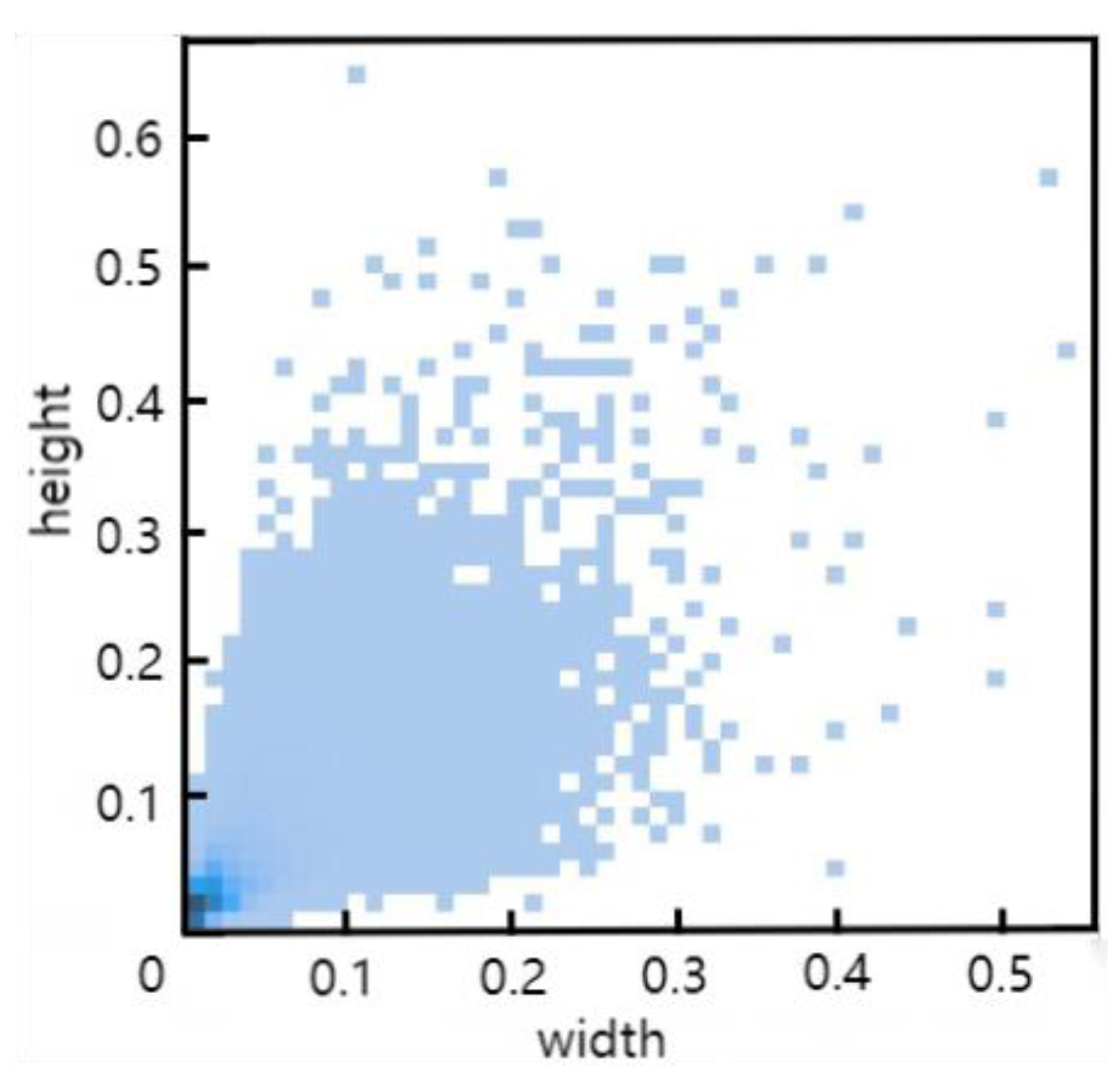 Figure 9 shows the distribution of all label sizes within the training set, with the x-axis representing label width and the y-axis representing label height. As observed, the labels are densely packed in the lower left corner, indicating a prevalence of small objects, making this dataset well-suited for this study.
