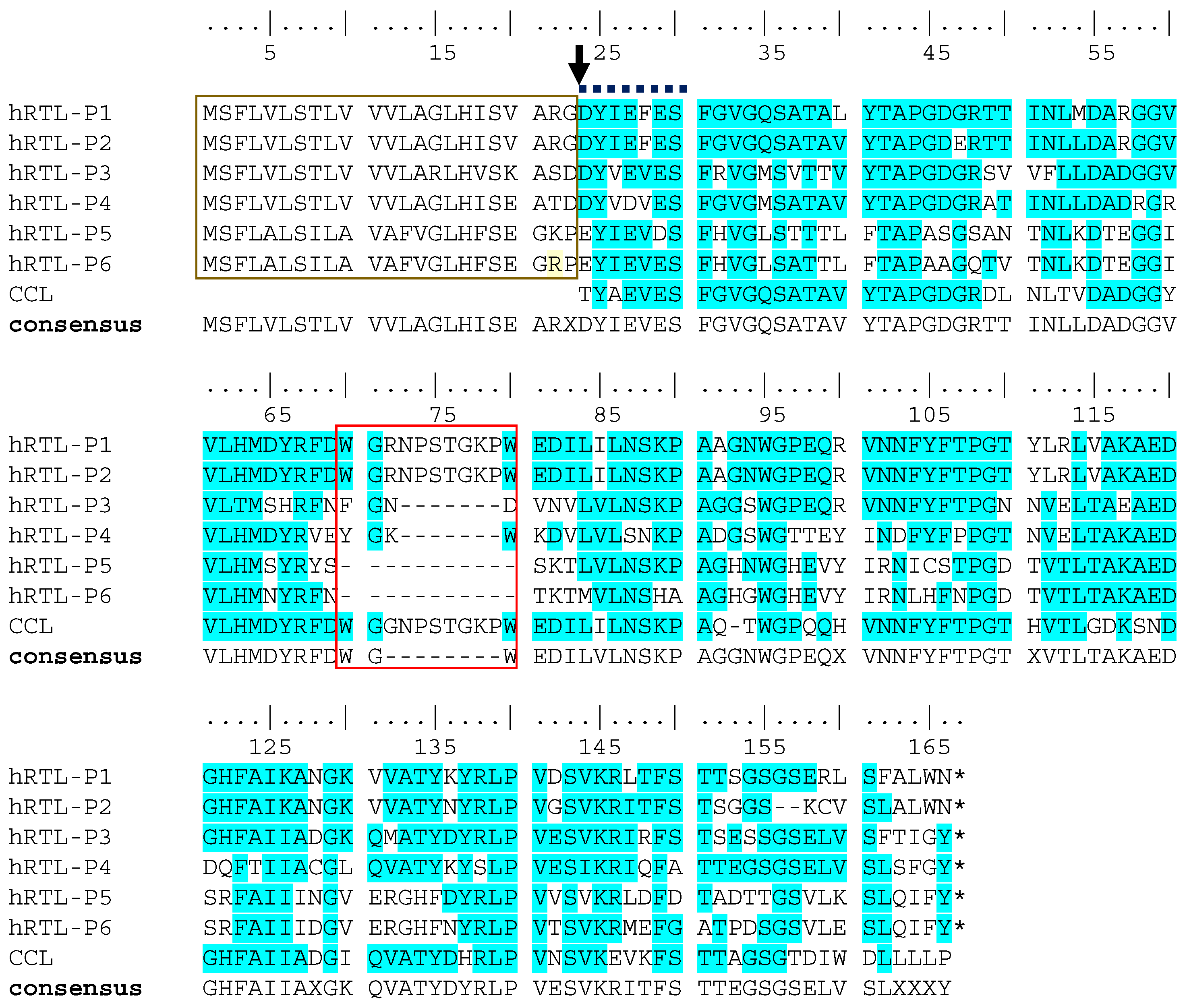 A tBLASTn search allowed to identify the complete protein sequence of two candidate hRTL precursor sequences, termed hRTL-P1 and hRTL-P2, confirming the correctness of the major sequence determined by Edman degradation. The inspection of the complete precursors identified the presence of 23 additional amino acid residues located at the N-terminal end, before the N-terminal residue detected by Edman degradation (
