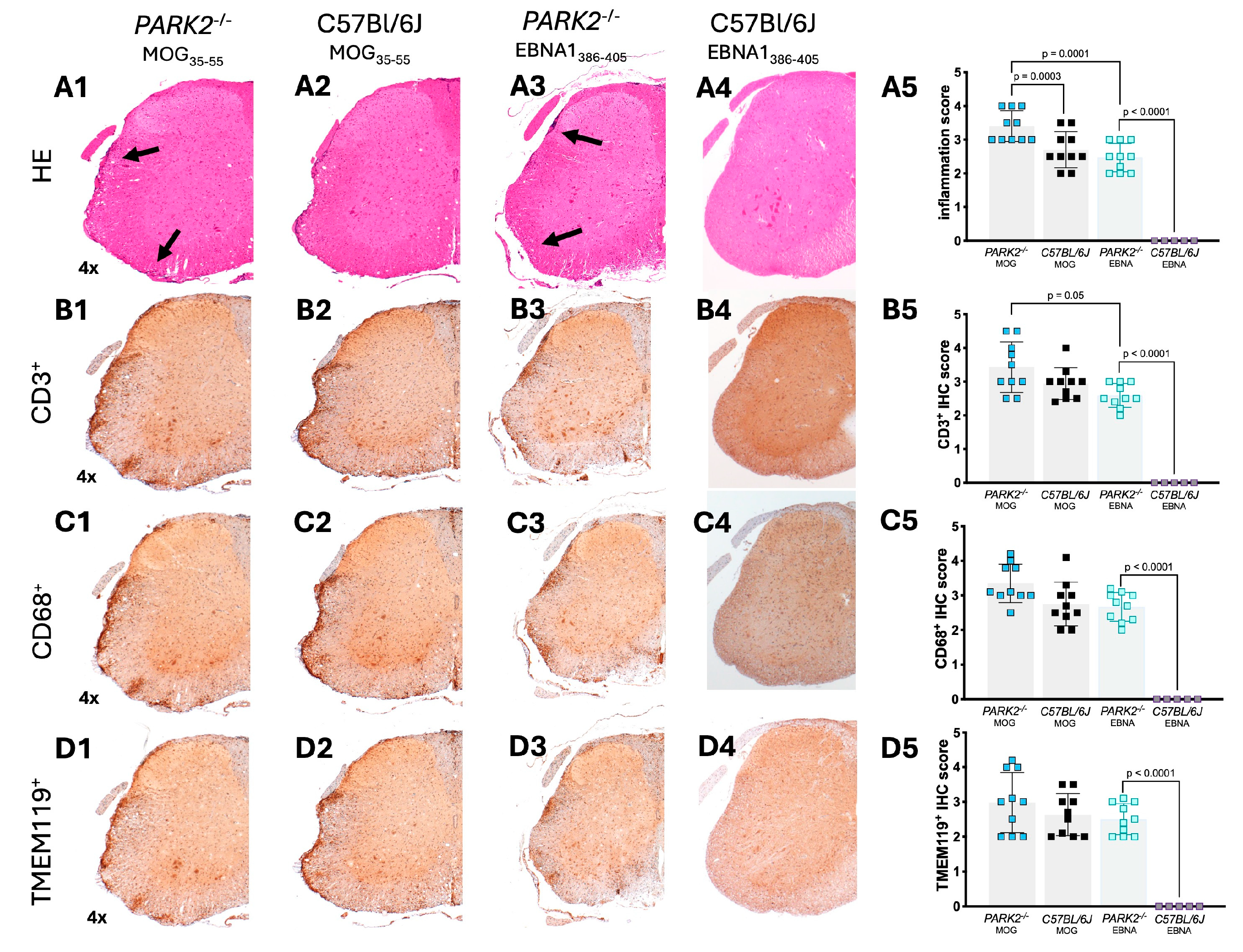 Our study confirms the encephalitogenic role of EBNA1386-405 but with several key differences. Firstly, only PARK2-/- mice developed symptoms similar to EAE, not wild-type mice. We did not evaluate the effect of EBNA1386-405 before or after MOG-EAE immunization or the effect of a boost. Instead, we assessed the direct immunization effect of EBNA1386-405 and compared it to MOG-EAE.