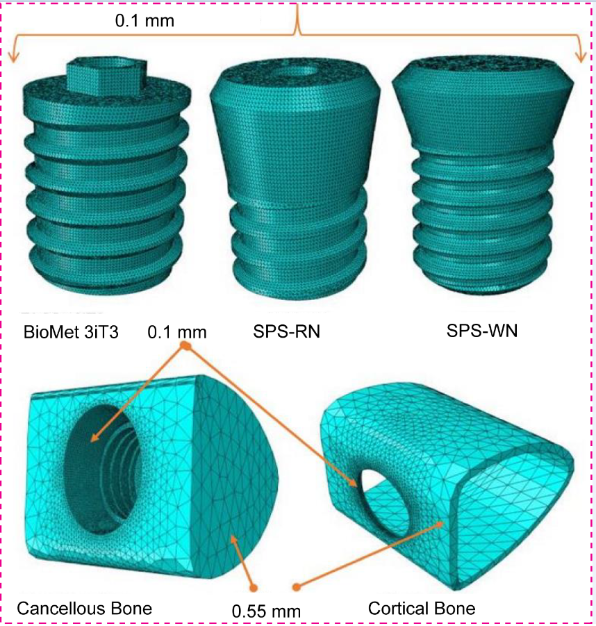 52], use the Finite Element Method (FEM), an advanced and adaptable computational method. In the field of dental implantology, FEM is critical for biomechanical characterization of dental implants and surrounding bone structures[