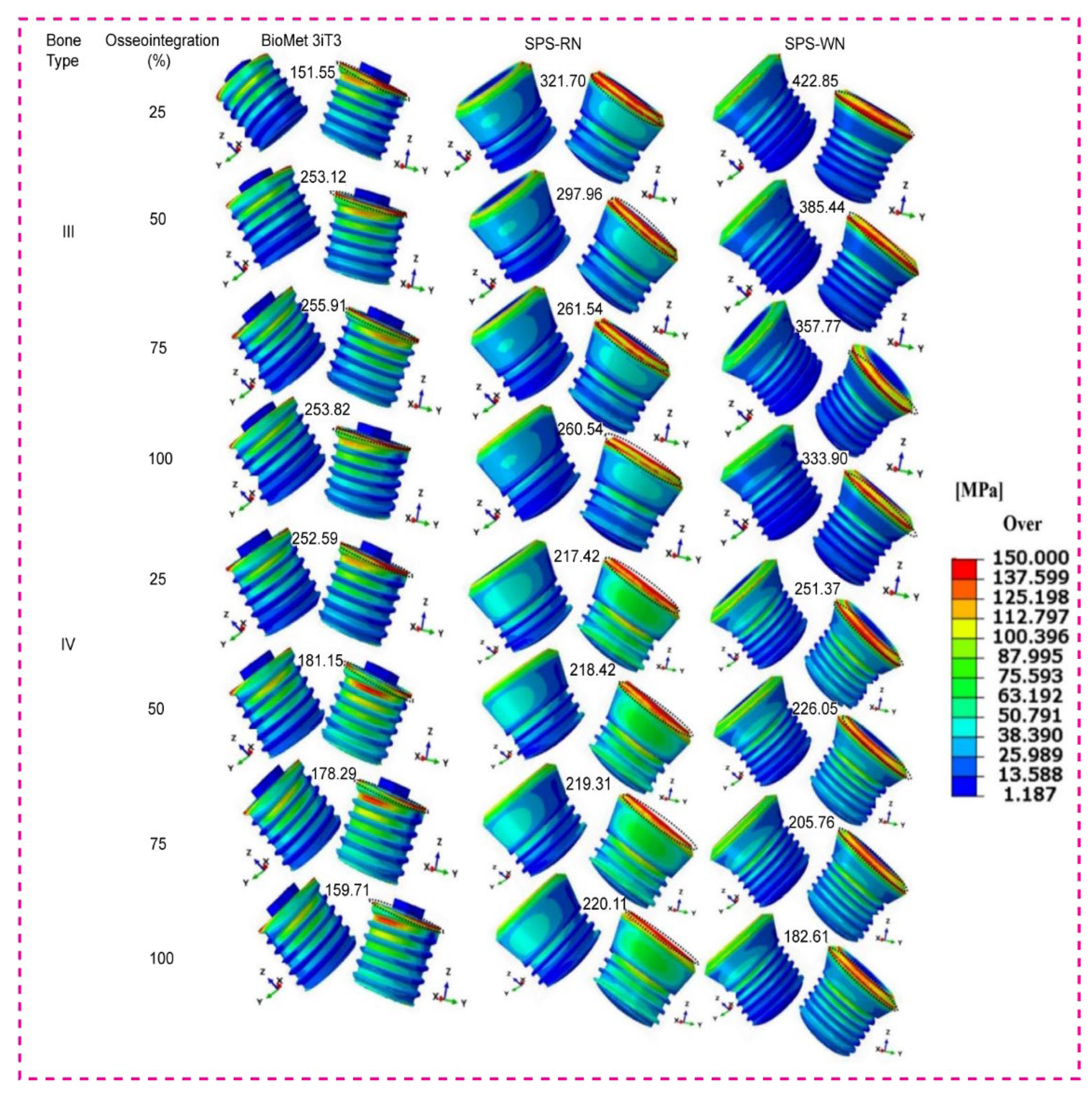 As osseointegration advances, Bone Type III, the BioMet 3iT3 implant, exhibits a significant rise in von Mises stress, beginning at 151.55 MPa at 25% and culminating at 255.91 MPa at 75%. Interestingly, with 100% osseointegration, the stress drops significantly to 253.82 MPa. The SPS-RN implant follows a similar trajectory, with a high starting stress of 321.7 MPa at 25% osseointegration and gradually decreasing to 260.51 MPa at 100% osseointegration. However, the SPS-WN implant suffers the greatest stress values of any implant type, beginning at 422.85 MPa at 25% osseointegration and decreasing to 333.9 MPa at 100%. These findings suggest that the SPS-WN implant puts more stress on the bone around it in Bone Type III, even when osseointegration improves. This raises the possibility of implant-bone interface stress concentration. Bone Type IV: The BioMet 3iT3 implant has a high initial von Mises stress of 252.59 MPa at 25% osseointegration, which decreases significantly to 179.51 MPa at 100%. The SPS-RN implant has a more constant stress level, beginning at 217.42 MPa at 25% osseointegration and rising slightly to 220.11 MPa at 100%. The von Mises stress on the SPS-WN implant slowly goes down, from 251.37 MPa at 25% osseointegration to 182.61 MPa at 100%. This shows that this implant design benefits the most from better osseointegration in Bone Type IV, which is less dense. Overall, the von Mises stress contours show that osseointegration is crucial for lowering stress at the bone-implant contact. When osseointegration is better, implants with higher starting stress values (SPS-WN) show bigger reductions, especially in bones that aren’t very thick (Type IV). These results, as shown in the contour plots, highlight the need for attaining optimum osseointegration to reduce mechanical stress and improve implant stability.