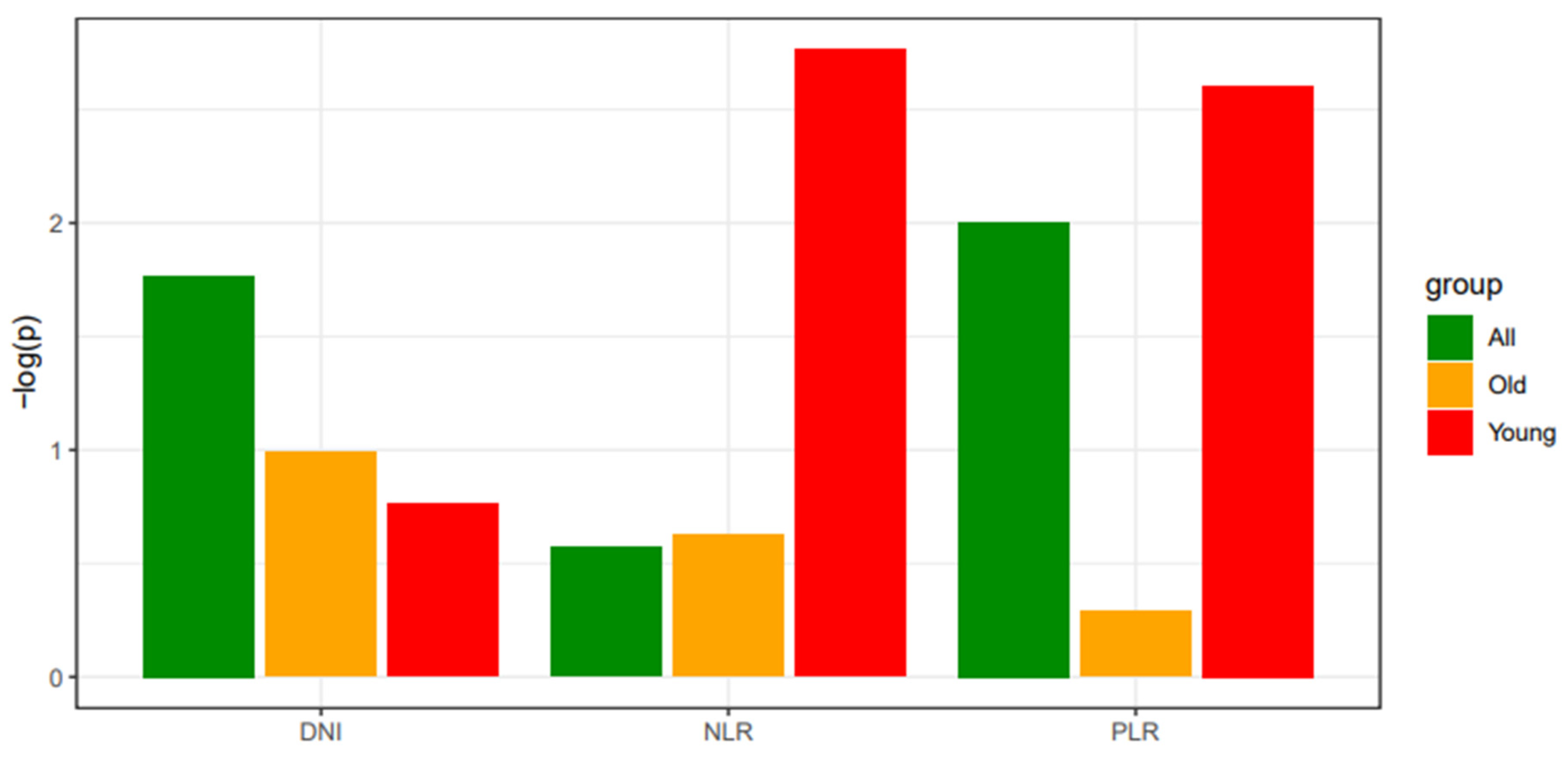 Hematologic indices DNI, NLR, and PLR were not independently significant predictors in multivariate analysis for the entire patient group, old patient group, or young patient group. However, for NLR and PLR, a trend toward proximity to a P-value of 0.05 was observed in the young patient group compared to the entire patient group. To visualize this trend, P-values were negated and log-transformed for comparison (