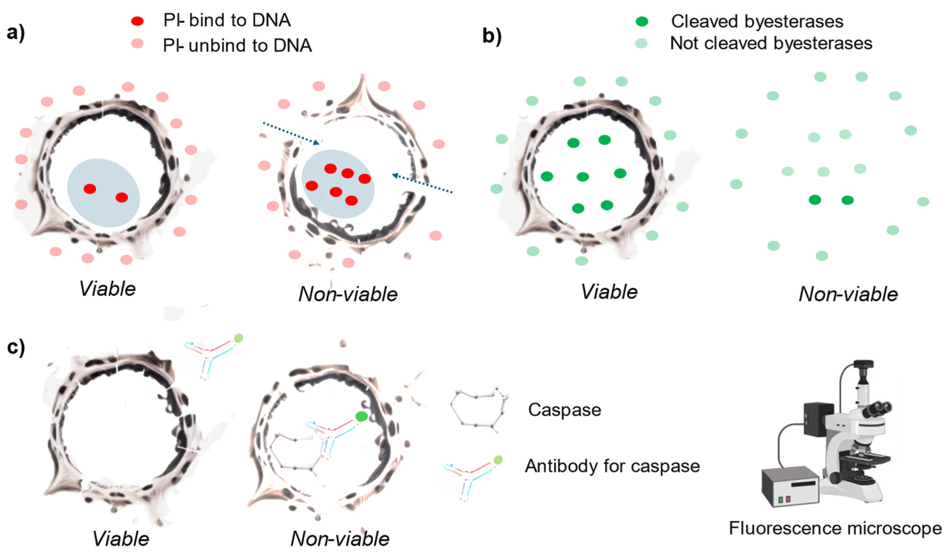 | Antibodies to cell-death-associated pathways (7) | Determine the presence of molecules associated to cell death pathways. | Fluorescence intensity of the dye attached to the antibody (Fluorescence microscope, Flow cytometer). | Specific, determines the type of the program cell death. | Expensive, unable to determine the viability of the cells with a different cell death pathway. |