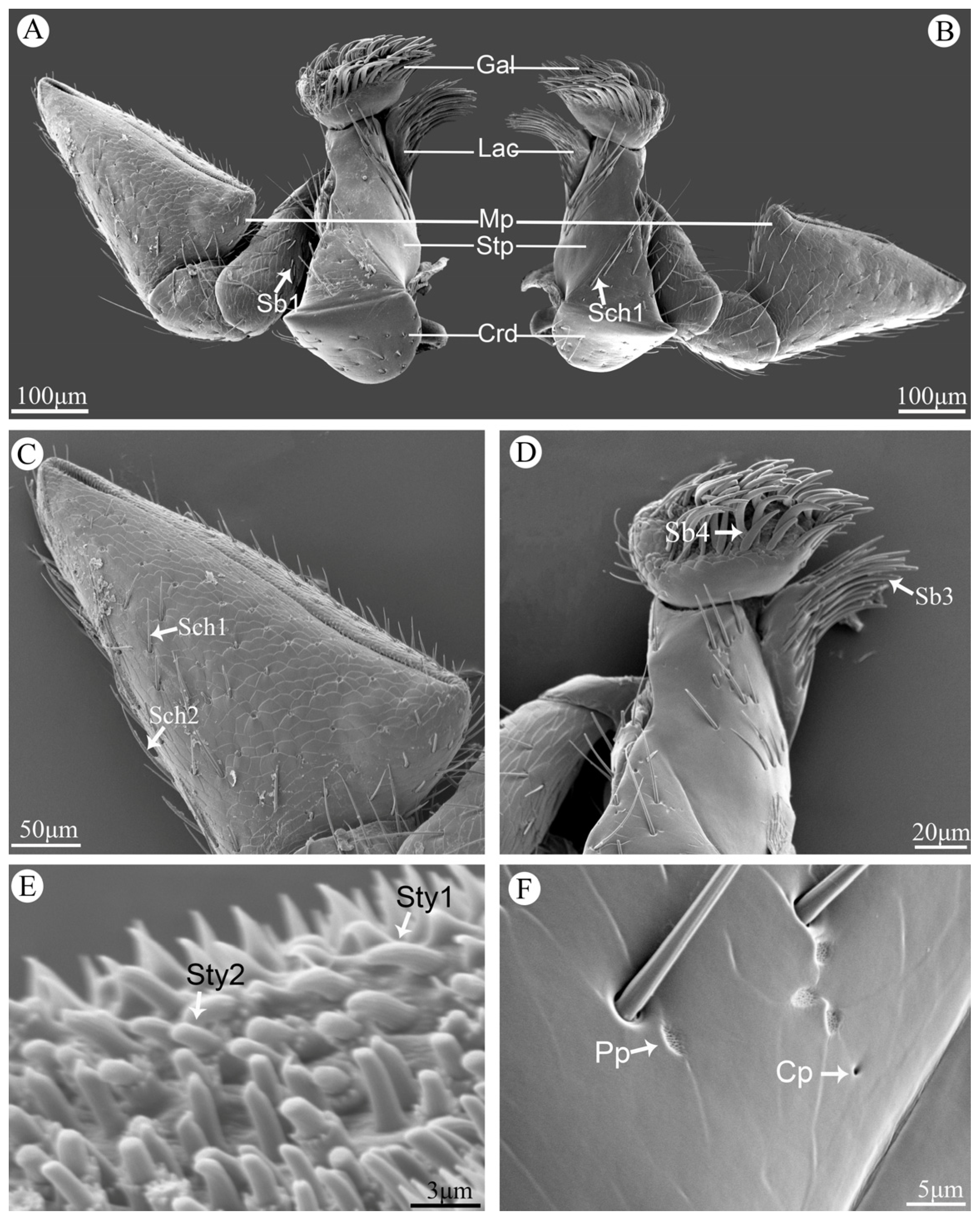 Figure 2E). Their lengths range from 32.4 to 40.3 μm, and their diameters range from 3.1 to 5.4 μm. They are only found on galea of maxillae and often gather together (