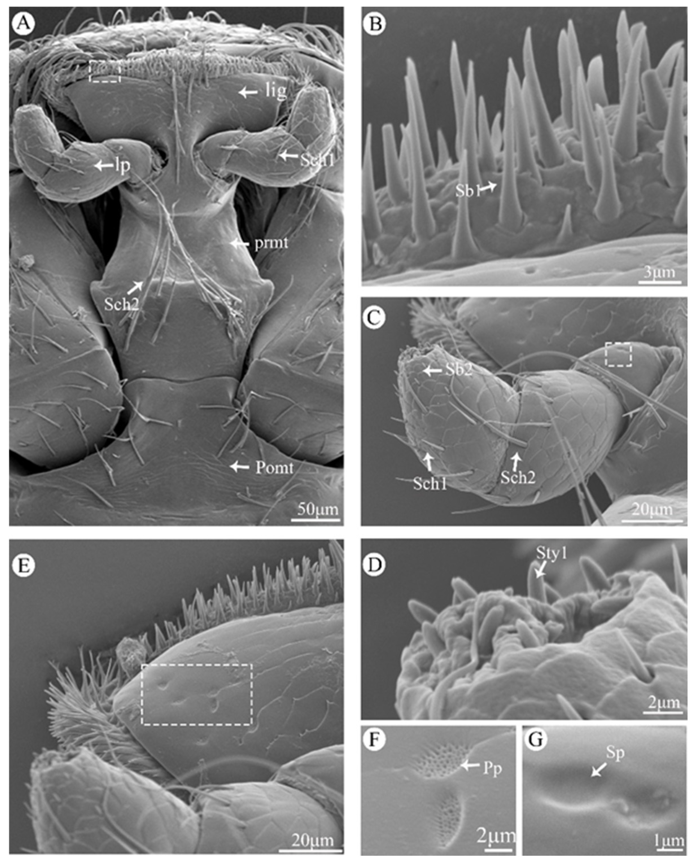44]. Sensilla chaetica, as a prominent mechanoreceptor on the mouthparts, detects external stimuli [