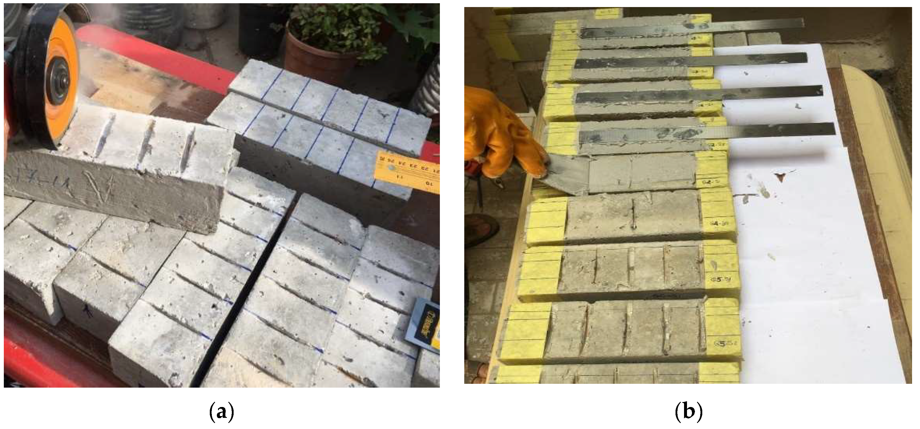 47] to avoid early cracks in concrete. Two strengthening types were applied: the EBR and. In the EBR the surface was ground using a fine grinder to remove any exposed particles or mortar and cleaned using a high pressure water jet. The layer of adhesive was rubbed on the bonding area, and the fiber was placed. In the method, the grooves were cut using an electric cutting machine equipped with the required depth, and the grooves were then cleaned from any particles and dust as shown in