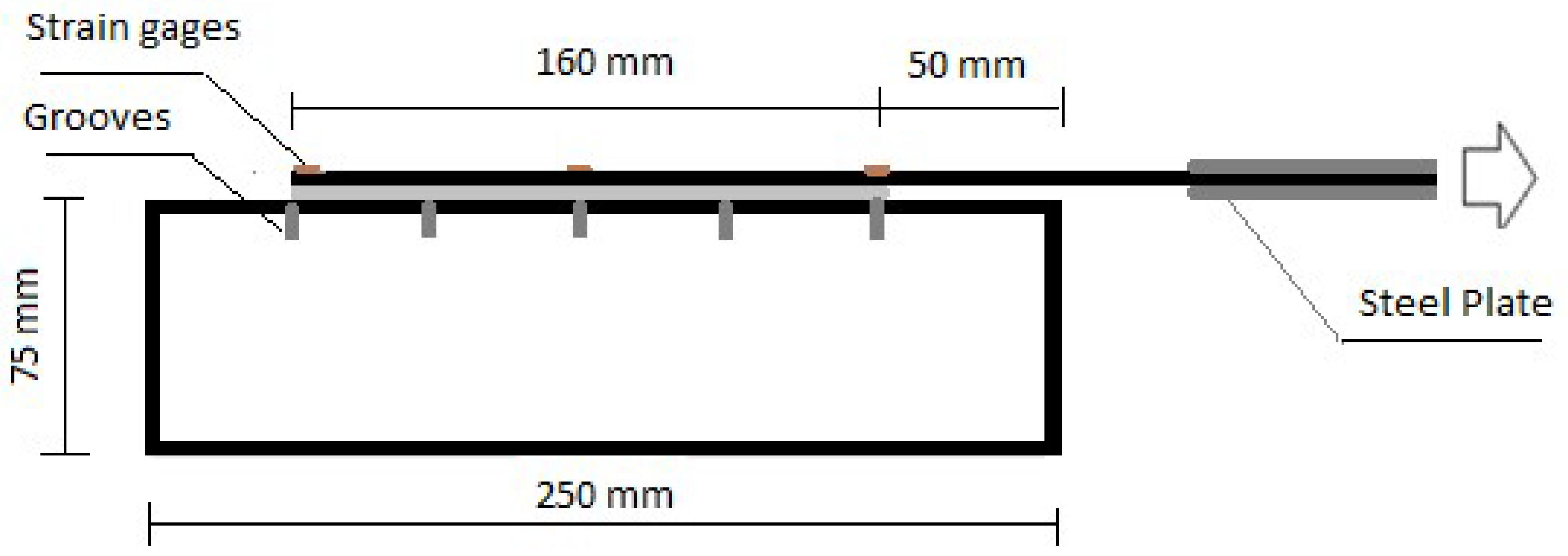 Figure 1 (b)). The fiber strips were bonded externally over the grooves, and the curing with 2 weeks was applied for the specimens at room temperature (23ºC). The fiber ends were glued between two steel plates for gripping.