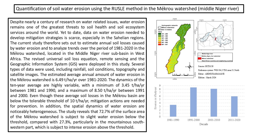 - N. A. Salifou, G. Abdelali, A.T. Amadou, “Water erosion in south-western Niger: impacts of natural and anthropogenic factors on soil losses,” Géomorphologie Reli. Process. Environ., vol. 28-, 2022, [Online]. Available:. https://doi.org/10.4000/geomorphologie.16744. [CrossRef]