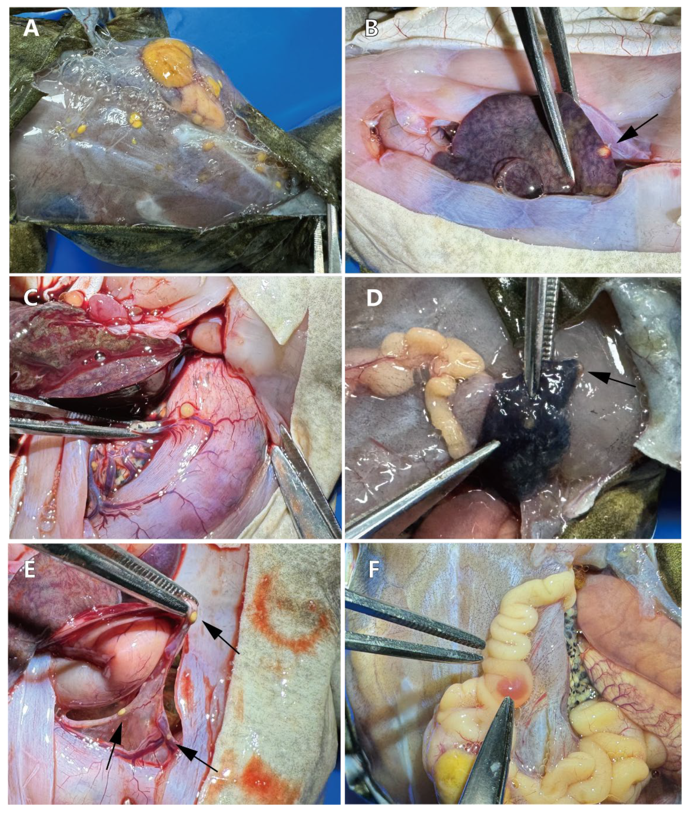 Figure 2D). Further examination of the body cavity revealed significant lesions in the mesentery (