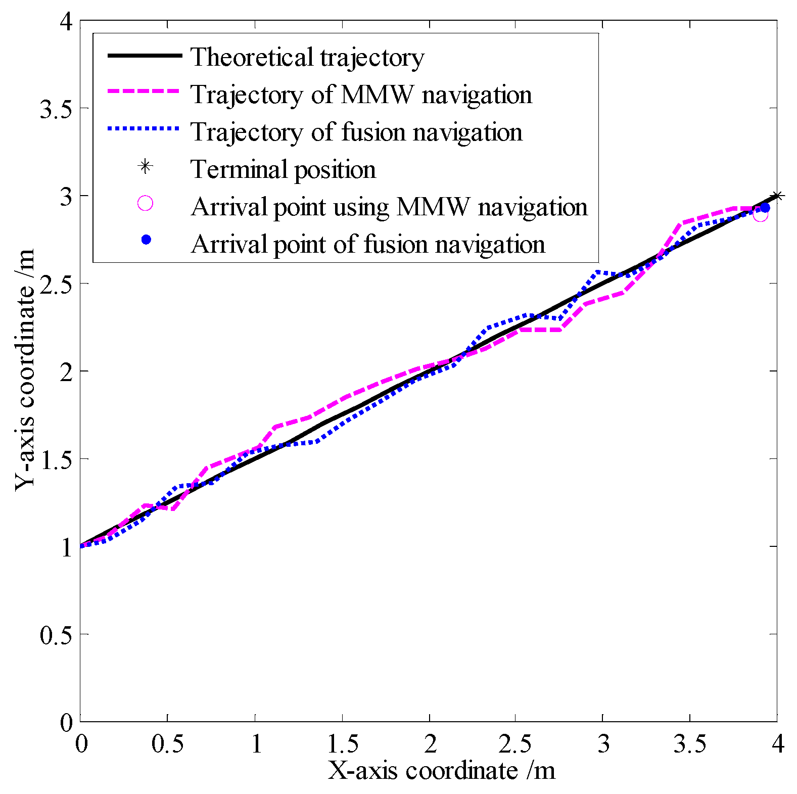 In smog and dust environments, vision and laser-based navigation methods can not be used effectively for controlling the movement of a robot. Autonomous operation of a security robot can be achieved in such environments by using millimeter wave (MMW) radar for the navigation system. In this study, an approximate center method under sparse point cloud is proposed, and a security robot navigation system based on millimeter wave radar is constructed. To improve the navigation accuracy of the robot, inertial navigation of the robot is integrated with MMW radar. Based on the concept of inertial navigation, the state equation for the motion principle of the robot is deduced. According to principle of MMW navigation, the measurement equation is derived, and the kinematics model of the robot is constructed. Further, by applying the Kalman filtering algorithm, a fusion navigation system of the robot based on MMW and inertial navigation is proposed. The experimental results show that the navigation error is close to the error of the navigation system with only MMW in the initial stage. With iterations of the filtering algorithm, the gain matrix converges gradually, and the error of the fusion navigation system decreases, leading to the stable operation of the robot. The localization error of the fusion navigation system is approximately 0.08 metre, and the navigation accuracy is better than that of the navigation system with only MMW radar.
