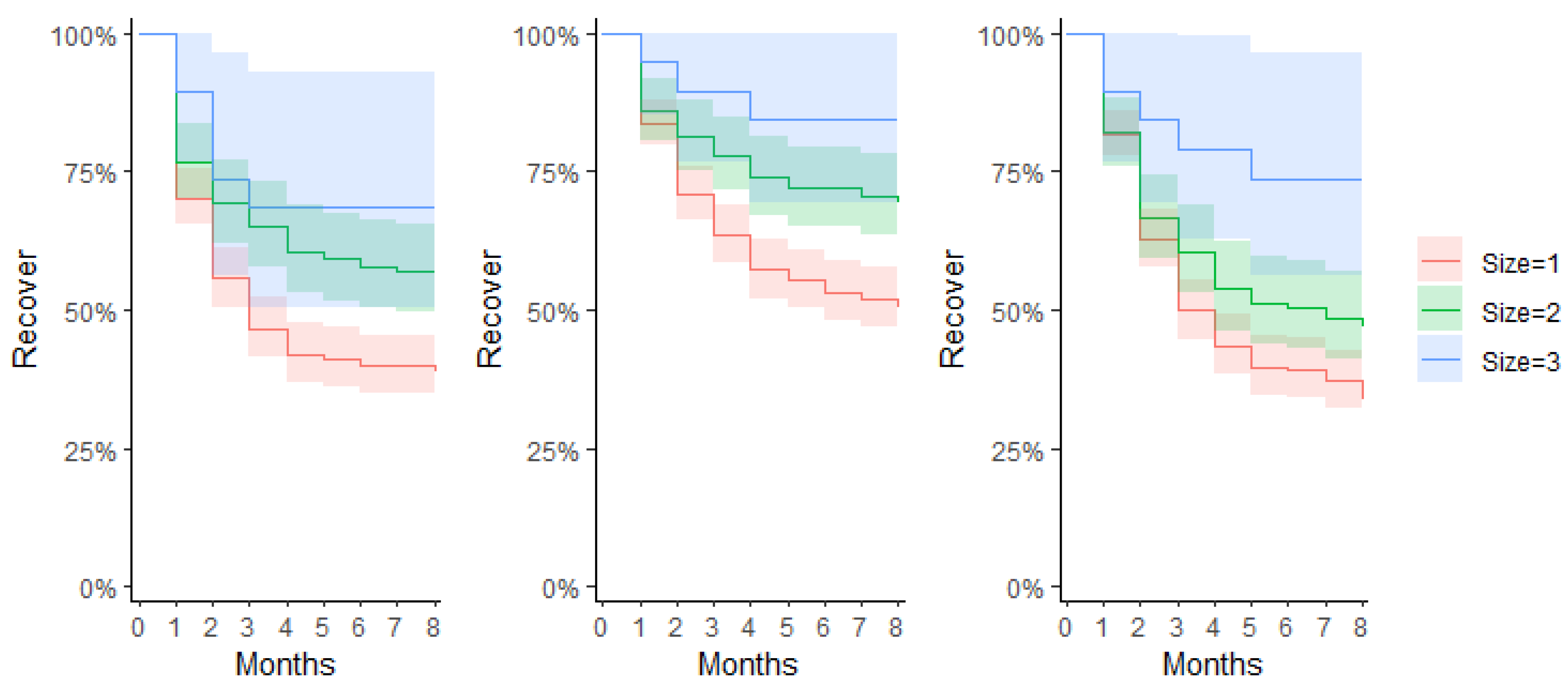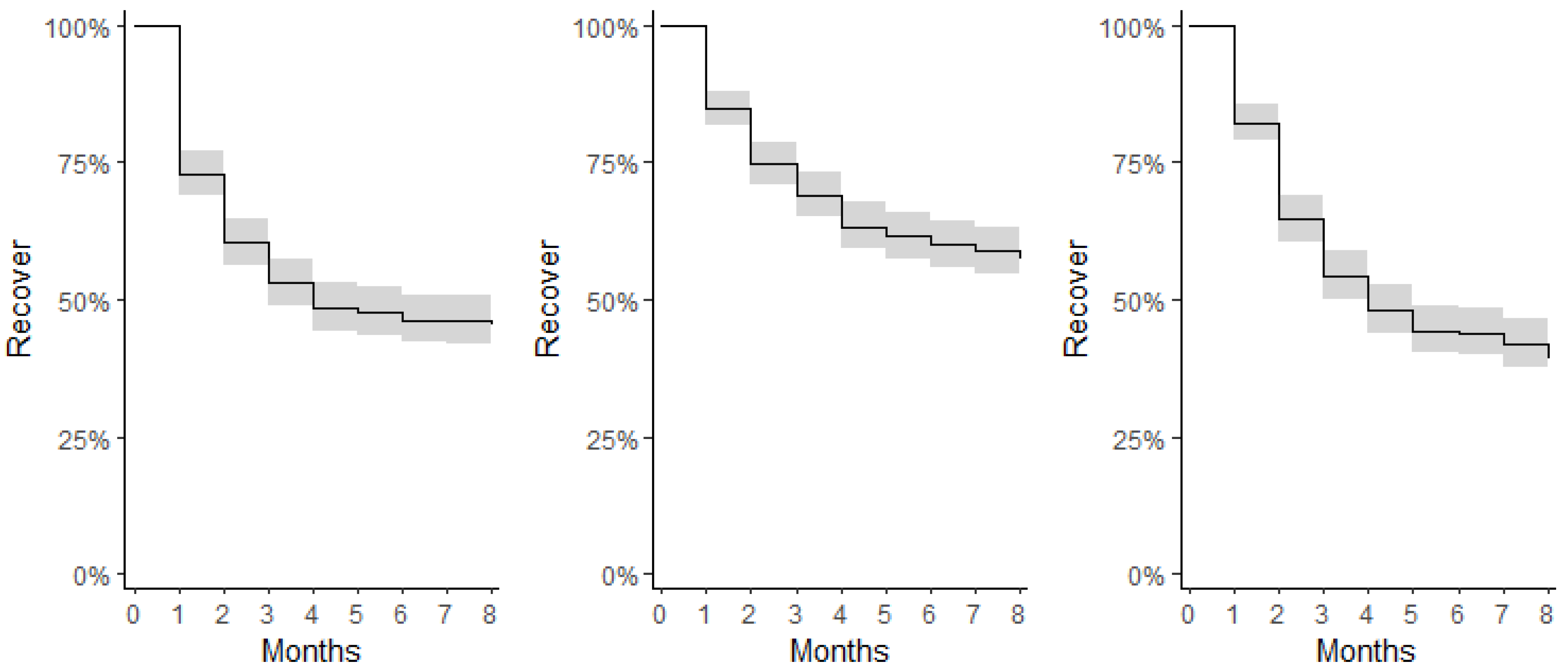 The global analysis by year using the Kaplan-Meier method shows that around 50% of municipalities are not experiencing a crisis, even validating that less municipalities entered a crisis in 2022. In 2020, we had a large percentage of recovery in the first month, while in 2023 we have two important stages of recovery in months 1 and 2. The graphs in this analysis need to be read in combination, with the lower part representing the municipalities that did not experience a crisis or were censored, and the upper part representing the first months will show whether the recovery was faster.