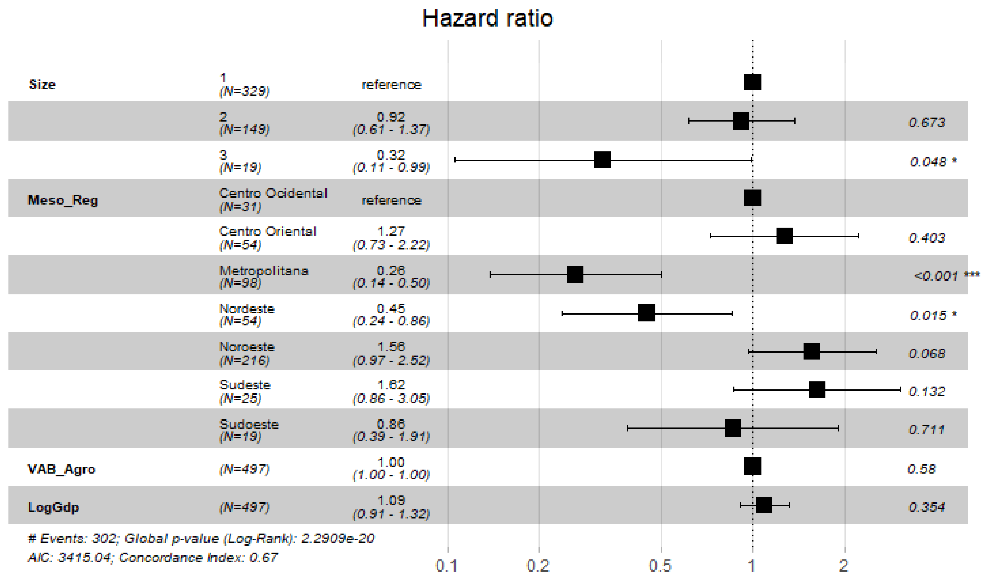 In the first analysis there are three size ranges of municipalities that are based in number of habitants. The first bracket comprises the municipalities with less or equal than 10,000 habitants, and the second is composed by municipalities from 10,001 to 99,999 habitants, and the third band are made up of those with 100,000 habitants or more. The second form of analysis is based on economic activity which are condensed into four main sectors (Agriculture, Livestock, Industry and service. The classification is based in the main sector of each municipality. The last analysis focuses on geographic location, composed by seven Meso-Regions. In the Cox's semiparametric technique, the effect of the size, mesoregion, and other covariates are tested.
