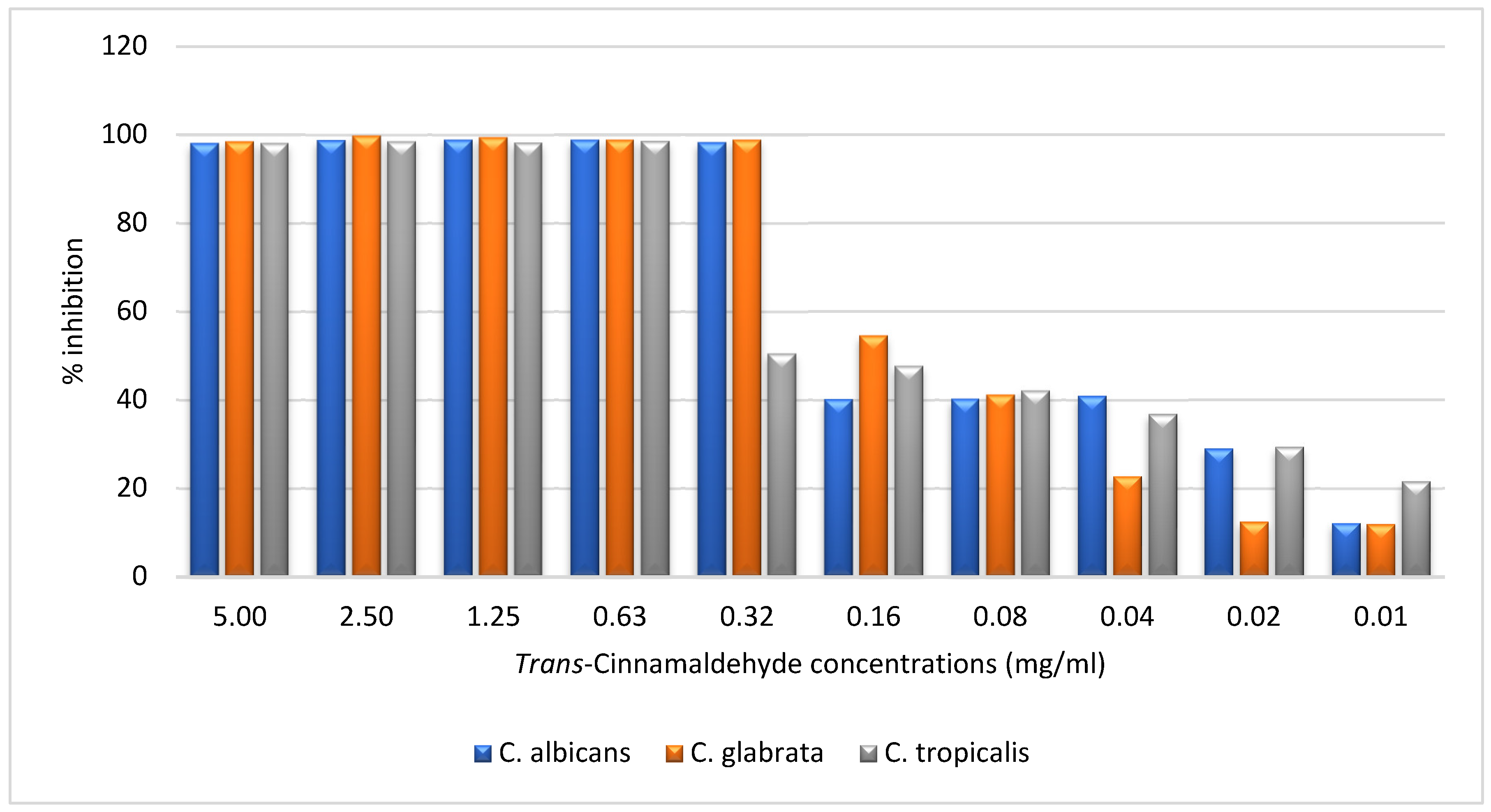 From a clinical perspective, our findings highlight the limitations of relying solely on current antifungal therapies for managing biofilm-related infections. The resistance exhibited by C. tropicalis to both agents suggests that monotherapies may be insufficient in addressing biofilm-associated candidiasis. This reinforces the need for integrated therapeutic strategies, combining natural bioactive compounds such as trans-Cinnamaldehyde with conventional antifungals, to enhance efficacy and minimize drug resistance.