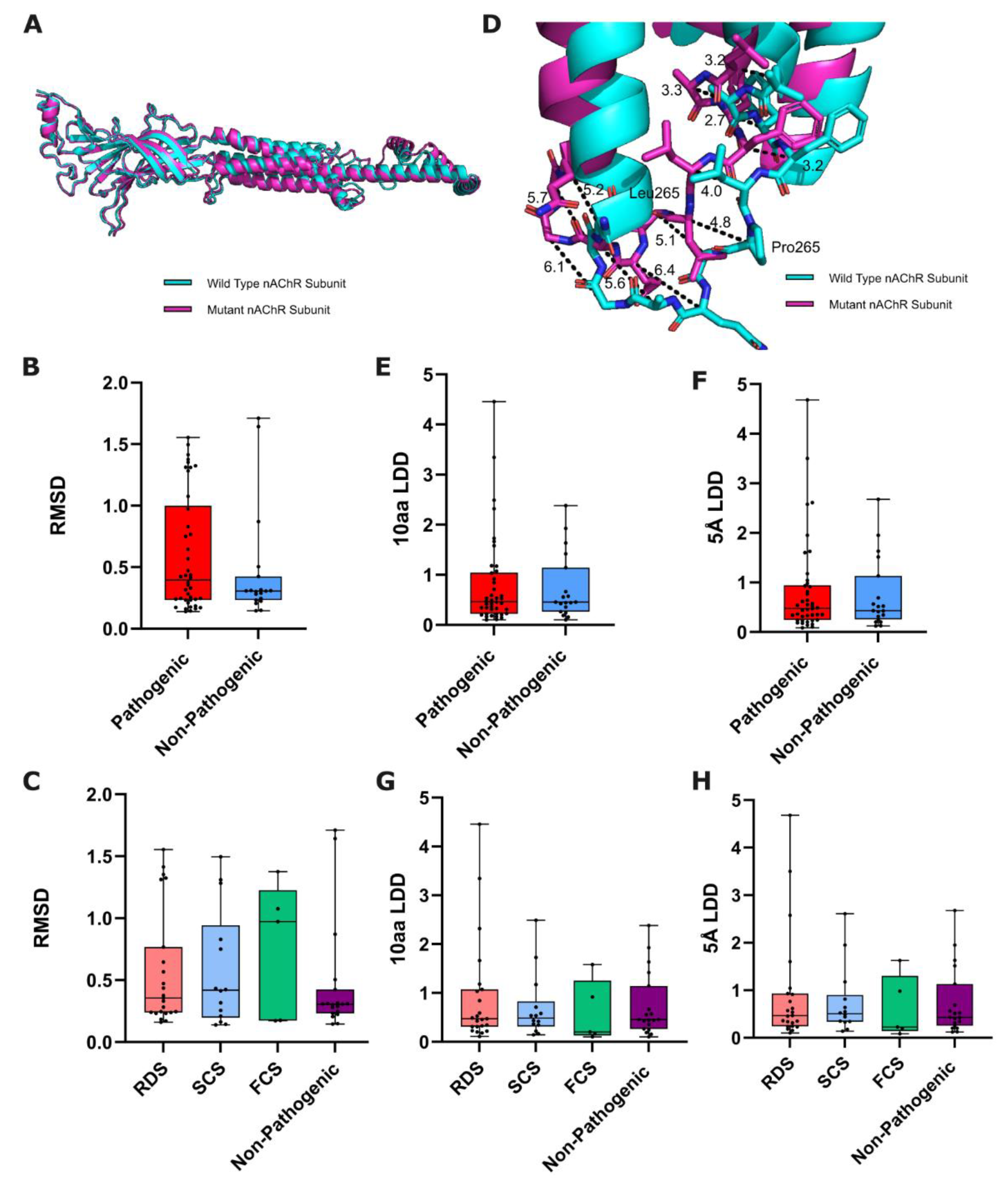 Structural-based metrics of nAChR subunit variant predicted effect. (A) Alignment of predicted wild-type and mutated nAChR subunits, from which RMSD is calculated. (B) Box plots comparing the RMSD of pathogenic and non-pathogenic variants from WT (p=0.3885: Mann-Whitney U test, n=42/19), and (C) between functional CHRN CMS subgroups and non-pathogenic variants (p=0.8345: Kruskal-Wallis test, n=23/14/5/19). (D) Example measurements of a variants’ local structural effect on corresponding residues in wild-type and P265L mutated CHRNE (from which LDD scores are derived). Box plots showing 10aa/5Å LDD scores of ColabFold-predicted wild-type and mutated nAChR subunits, compared between (E-F) pathogenic and non-pathogenic variants (10aa p=0.8926, 5Å p=0.8804: Mann Whitney U test, n=42/19), and (G-H) between functional CHRN CMS subgroups and non-pathogenic variants (10aa p=0.7738, 5Å p=0.8407: Kruskal-Wallis test, n=23/14/5/19).