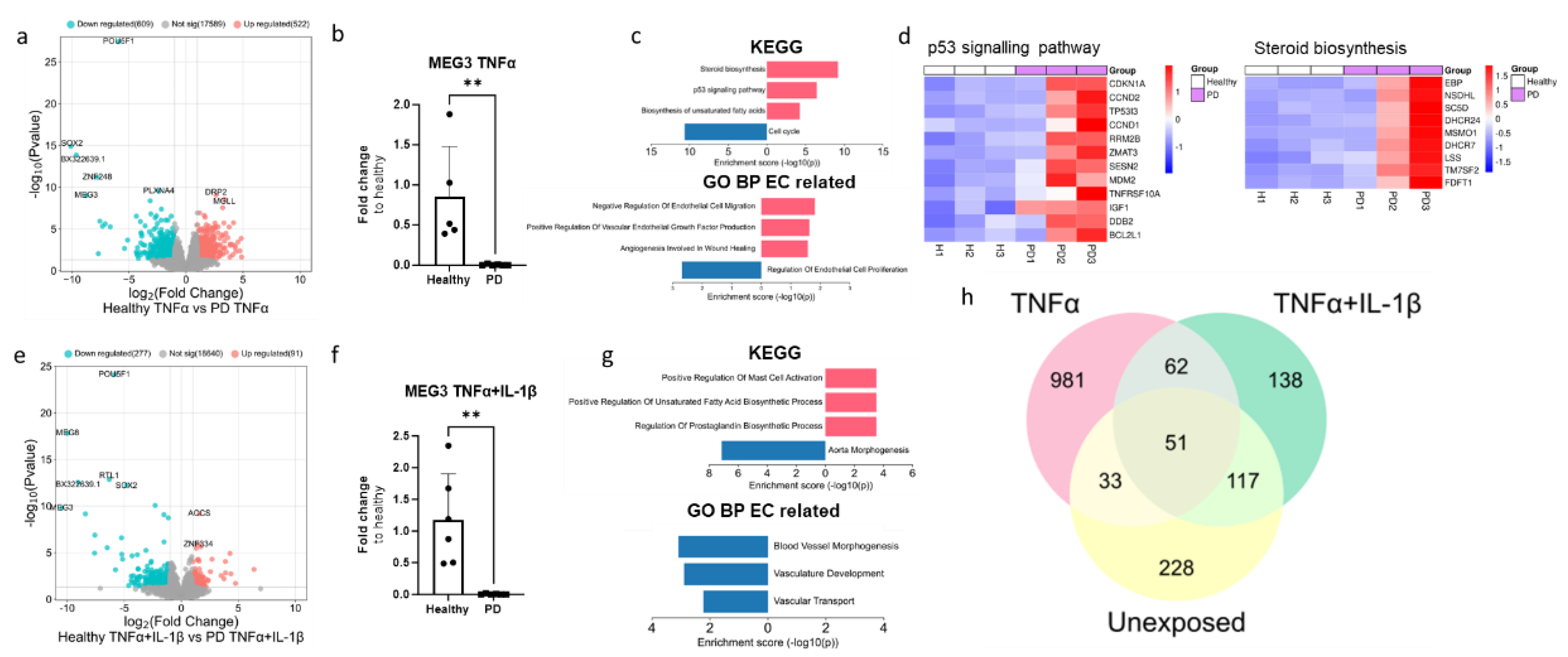 Transcriptional profile of PD endothelial cells after inflammatory stimuli. (a)Volcano plot of up- and down-regulated DEGs between healthy and PD ECs after TNFα exposure based on p-value (<0.05) and absolute log2 Fold >1. (b) Gene expression of MEG3 in healthy and PD ECs quantified with qPCR. n=5 (healthy), 6 (PD LRRK2). Two independent experiments. (c) KEGG and GO pathways of up- and down-regulated DEGs in PD ECs compared to healthy. (d) Heatmap showing genes related to p53 signalling pathway and steroid biosynthesis in healthy and PD ECs. (e) Volcano plot of up- and down-regulated DEGs between healthy and PD ECs after TNFα+IL-1β exposure based on p-value (<0.05) and absolute log2 Fold >1. (f) Gene expression of MEG3 in healthy and PD ECs. n=6 (healthy), 6 (PD LRRK2). Two independent experiments. (g) KEGG and GO pathways of up- and down-regulated genes in PD ECs compared to healthy. (h) Venn diagram of DEGs between healthy and PD ECs in unexposed, TNFα and TNFα+IL-1β exposed conditions. All exposures lasted for 4 h and the concentrations were: 10 ng/ml TNFα or 10 ng/ml TNFα+ IL-1β. Data shown as mean +/-SD, n= 3, unpaired t-test ** p< 0.01.