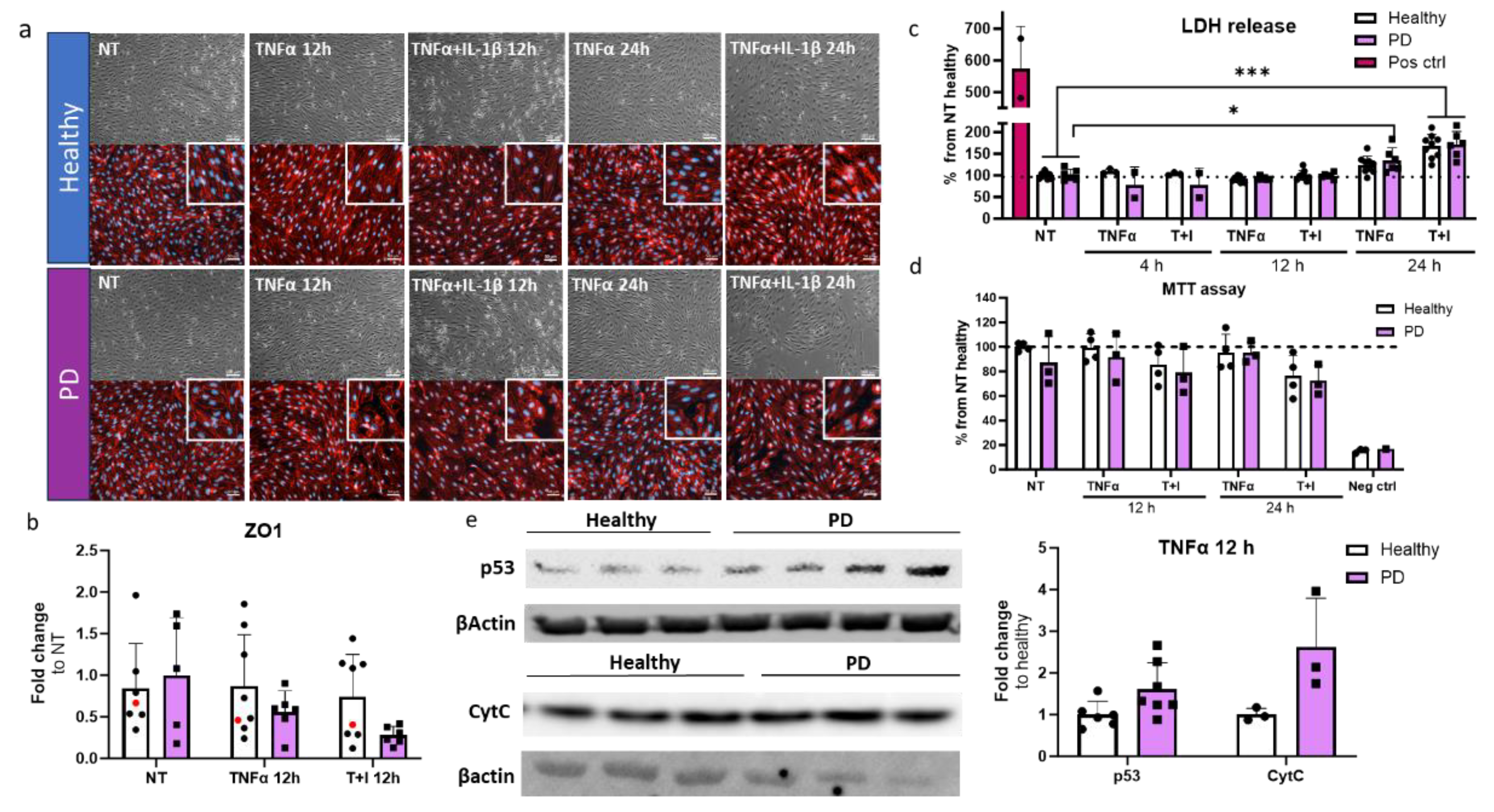 Cell viability and cytotoxicity in endothelial cells after inflammatory stimuli. (a) Representative bright field (upper panel) and immunofluorescence images stained for ZO1 (lower panel) of ECs, non-exposed, 12 h TNFα and TNFα+IL-1β exposed, 24 h TNFα and TNFα+IL-1β exposed. Scale bar 50 µm. (b) Quantification of the immunocytochemistry. Fluorescence normalized to DAPI. n=6-7 (Healthy), 1 (isogenic),5-6 (PD LRRK2) from two independent experiments. (c) LDH release from ECs of non-exposed and after 4, 12 and 24 h TNFα and TNF+IL-1β (TI) exposure. n= 3-9 (healthy), 2-6 (PD LRRK2) from two independent experiments. (d) MTT assay of non-treated and 12 and 24 h TNFα and TNF+IL-1β treated ECs. n= 2-4 (healthy), 1-3 (PD LRRK2. (e) Western blot analysis of p53 and Cytochrome C (CytC) in healthy and PD EC normalized to β-actin protein levels. Representative images and quantification of the data. n=3-6 (healthy), 3-7 (PD LRRK2). Data shown as mean +/-SD. Two-way ANOVA with Tukey´s multiple comparison test, p*<0.05, p**<0.01, p***<0.001.
