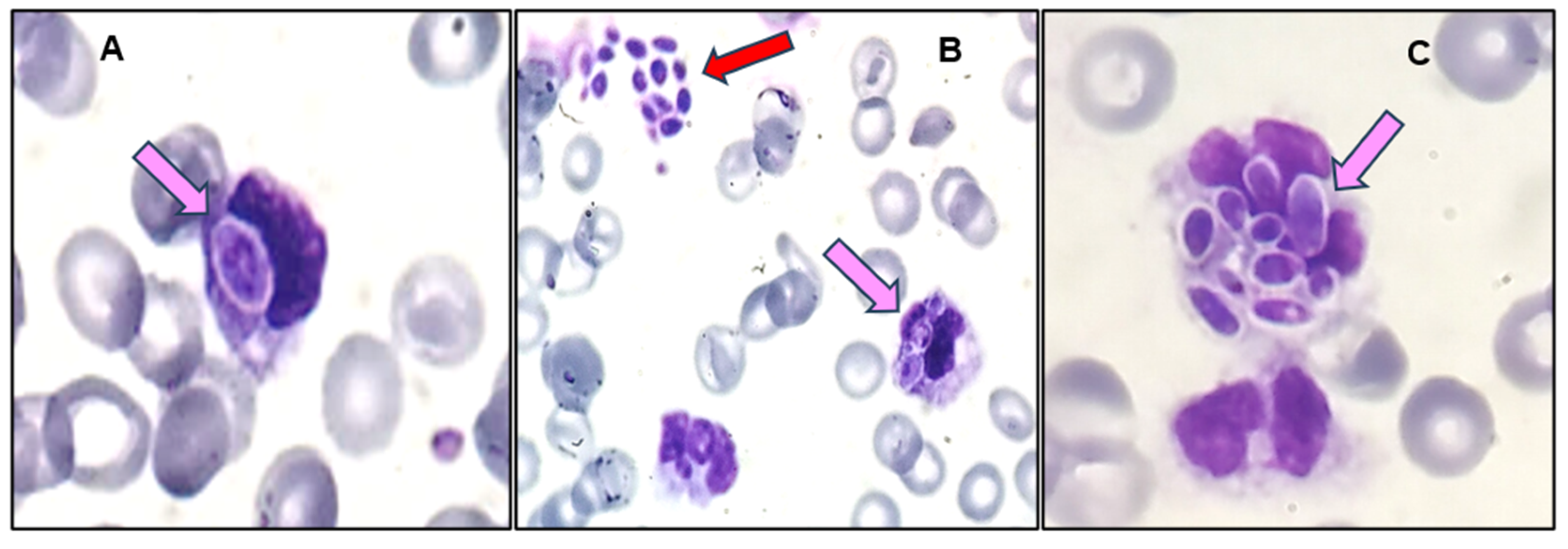 - Garg, N.; Gupta, R.J.; Siroha, A.; Kumar, S. Peripheral Blood Smear: Hematologist Buddy to Catch Dangerous Budding: A Report of Two Cases. J Microsc Ultrastruct. 2022, 10, 211–213. [Google Scholar] [CrossRef] [PubMed] [PubMed Central]