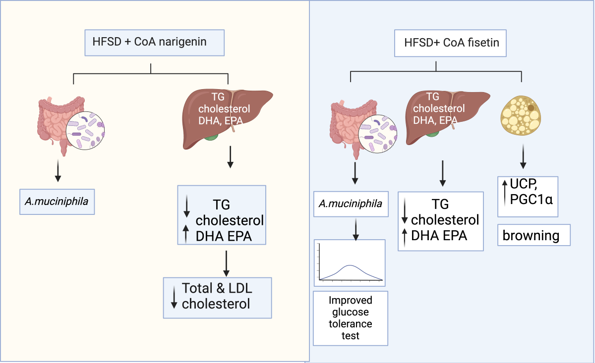 Attempts are being made to modify the solubility of these compounds to potentially increase the effects of these molecules in the body, as well as their interaction with the gut microbiota. However, more research is still needed in this area to understand the potential effects on the host. Therefore, the aim of the present study was to determine the effect of the CoA bioactive compounds naringenin and fisetin on the gut microbiota, energy expenditure, lipid metabolism and expression of genes involved in thermogenesis in mice fed a high-fat high-sucrose diet (HFSD).