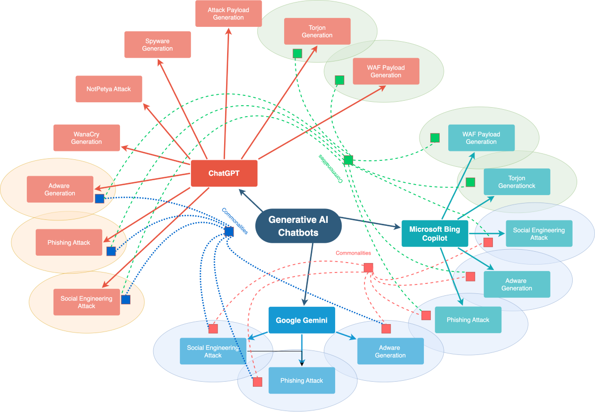 Figure 1 illustrates the commonalities in attack capabilities among three prominent AI models: ChatGPT, Google Gemini, and Microsoft Bing Copilot. The diagram provides a clear visual representation of the shared vulnerabilities these systems may face, including Social Engineering Attacks, Phishing Attacks, and Adware.
