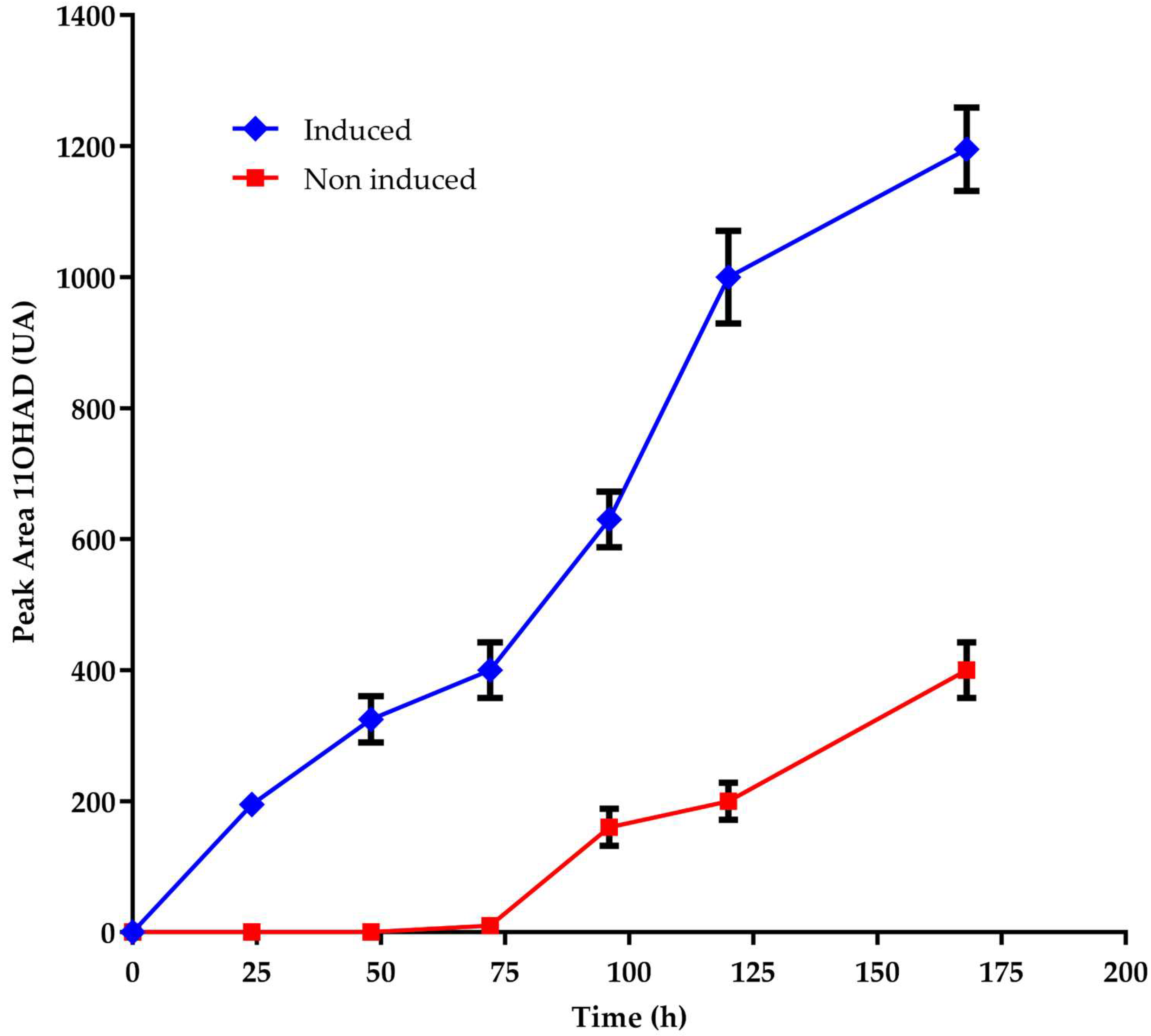 Appearance of 11-α-hydroxy-AD from AD in A. nidulans cultures previously grown with AD (blue) and without AD (red). The number of biological replicates is 3. The measurements were taken at a wavelength of 240 nm.