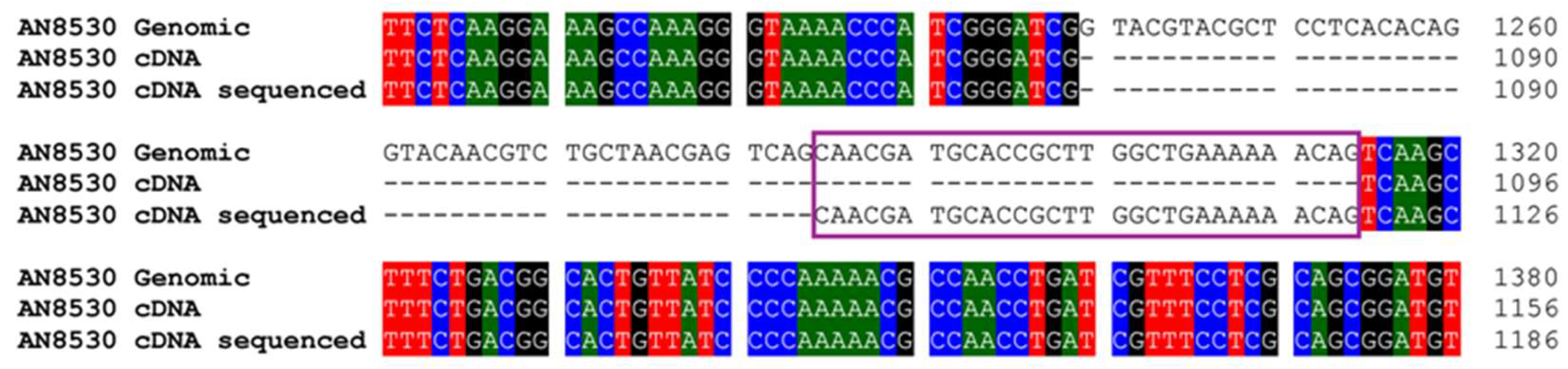 Alignment of genomic, database cDNA, and sequenced cDNA for CYP68L1 from A. nidulans in this study. The portion of the exon expansion is shown in this figure.