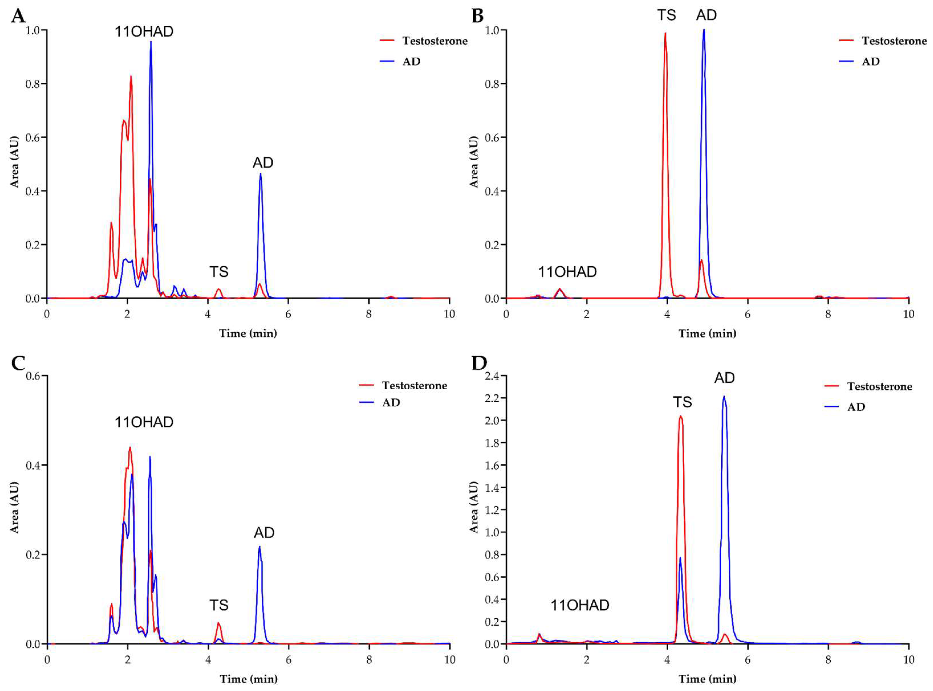 14]. Under these conditions, the retention times were as follows (in minutes): AD, 5.3 ± 0.3; 11-α-hydroxylation of AD (11-α-OH-AD), 2.6 ± 0.2; PG, 10.8 ± 0.5; 11-α-hydroxylation of PG (11-α-OH-PG), 3.4 ± 0.3; and TS, 4.3 ± 0.2.