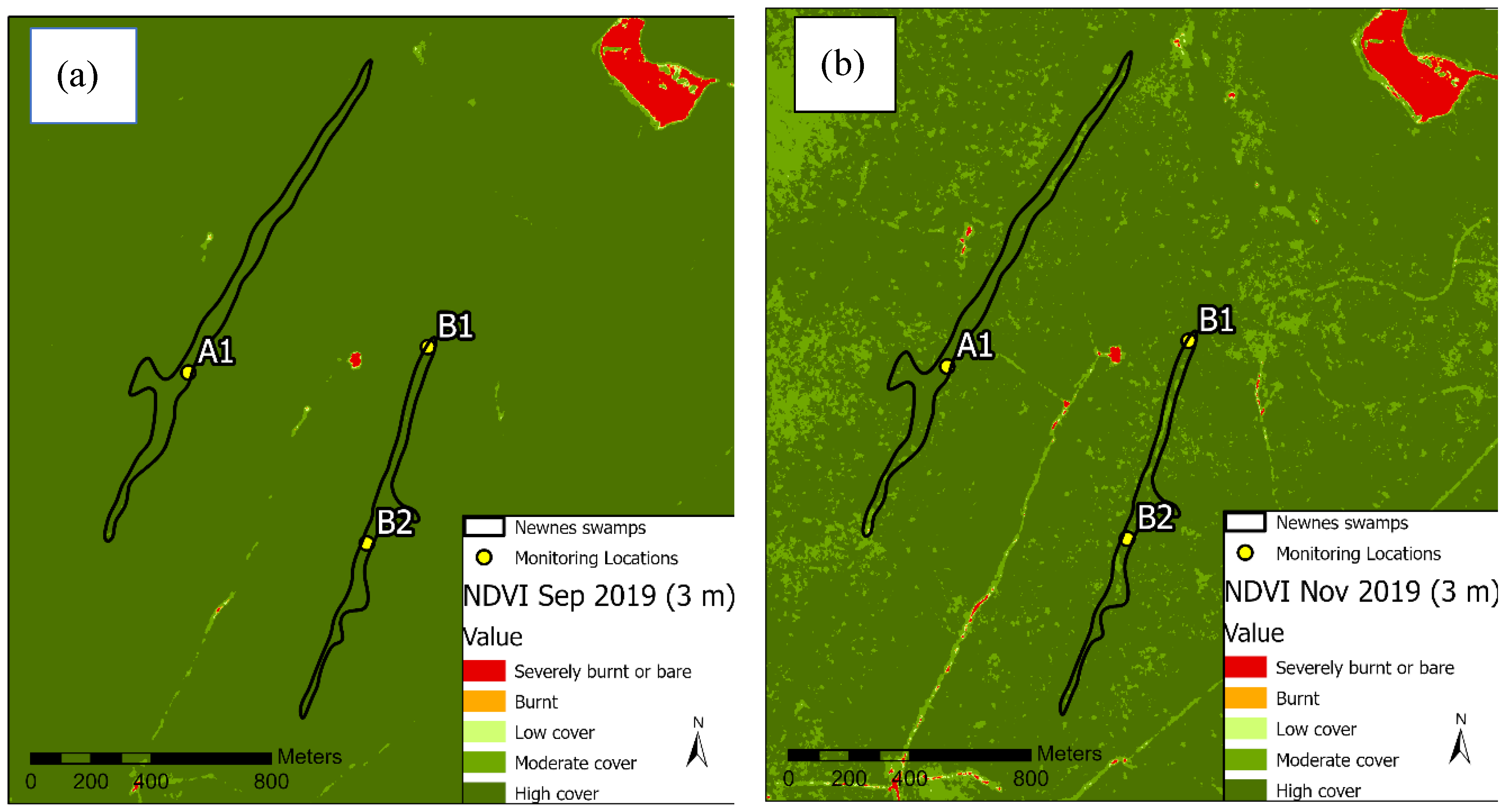 Figure 4). Both swamps reached a peak NDVI of 0.8 in July 2019. Then, in both, a significant reduction in NDVI values was observed from September 2019 possibly due to the drought condition (