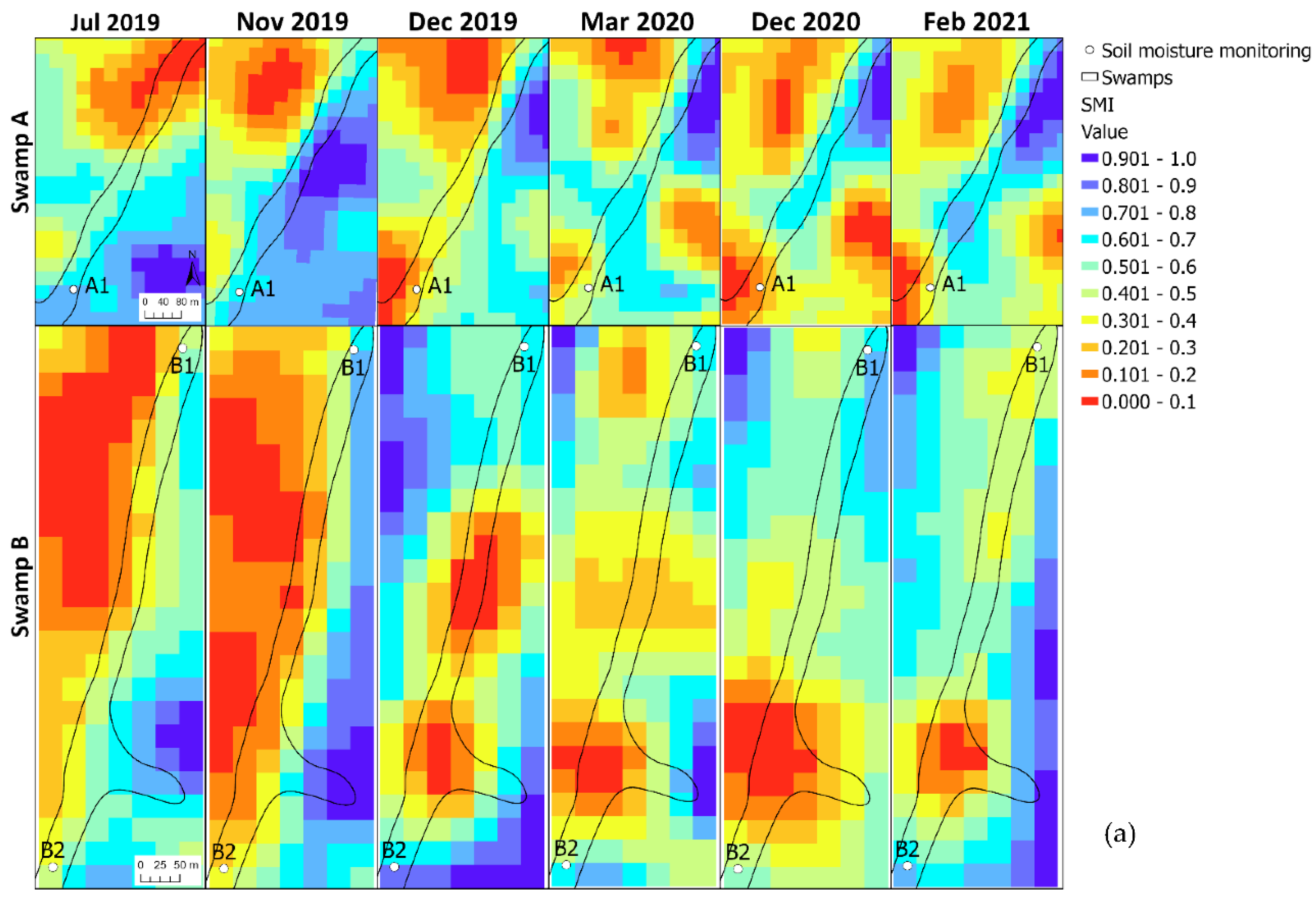 Soil Moisture Index (SMI) fluctuations in Newnes Plateau study swamps (a) SMI maps of Swamp A and Swamp B topsoil from July 2019 to February 2021 and (b) SMI time series for topsoil of studied sites in Newnes Plateau (monitoring locations A1, B1, B2) (the wildfire occurred in December 2019).