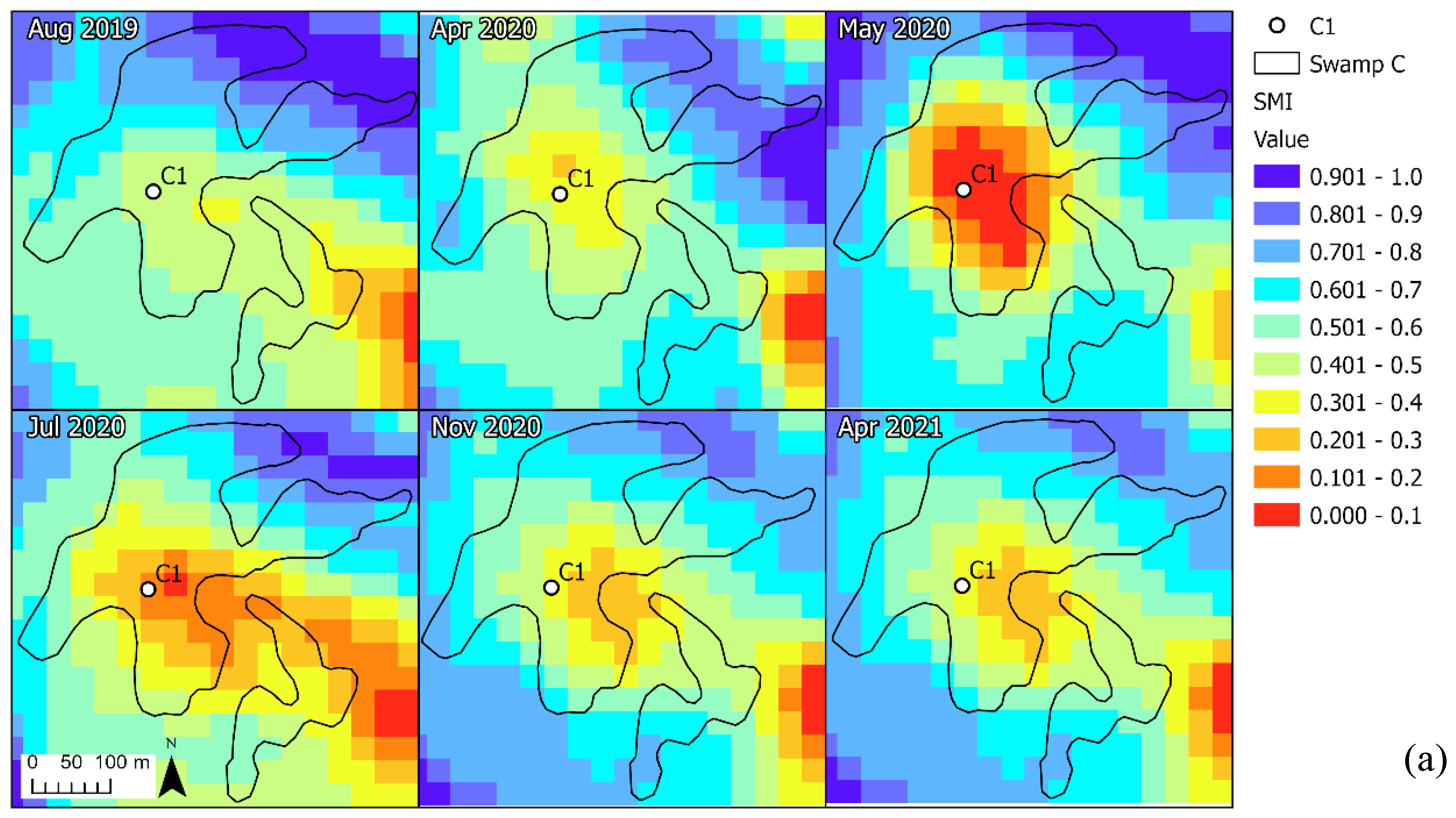 NDVI and SMI values were extracted from individual pixels corresponding with monitoring locations within each swamp and plotted against time to understand the vegetation and moisture changes pre and post fire events. Pixels were chosen from homogeneous areas where the swamp width exceeded 30 m to minimize interference from non-swamp vegetation along the swamp edges. A cloud filter of less than 5% was applied in GEE to reduce cloud interference in the plots.