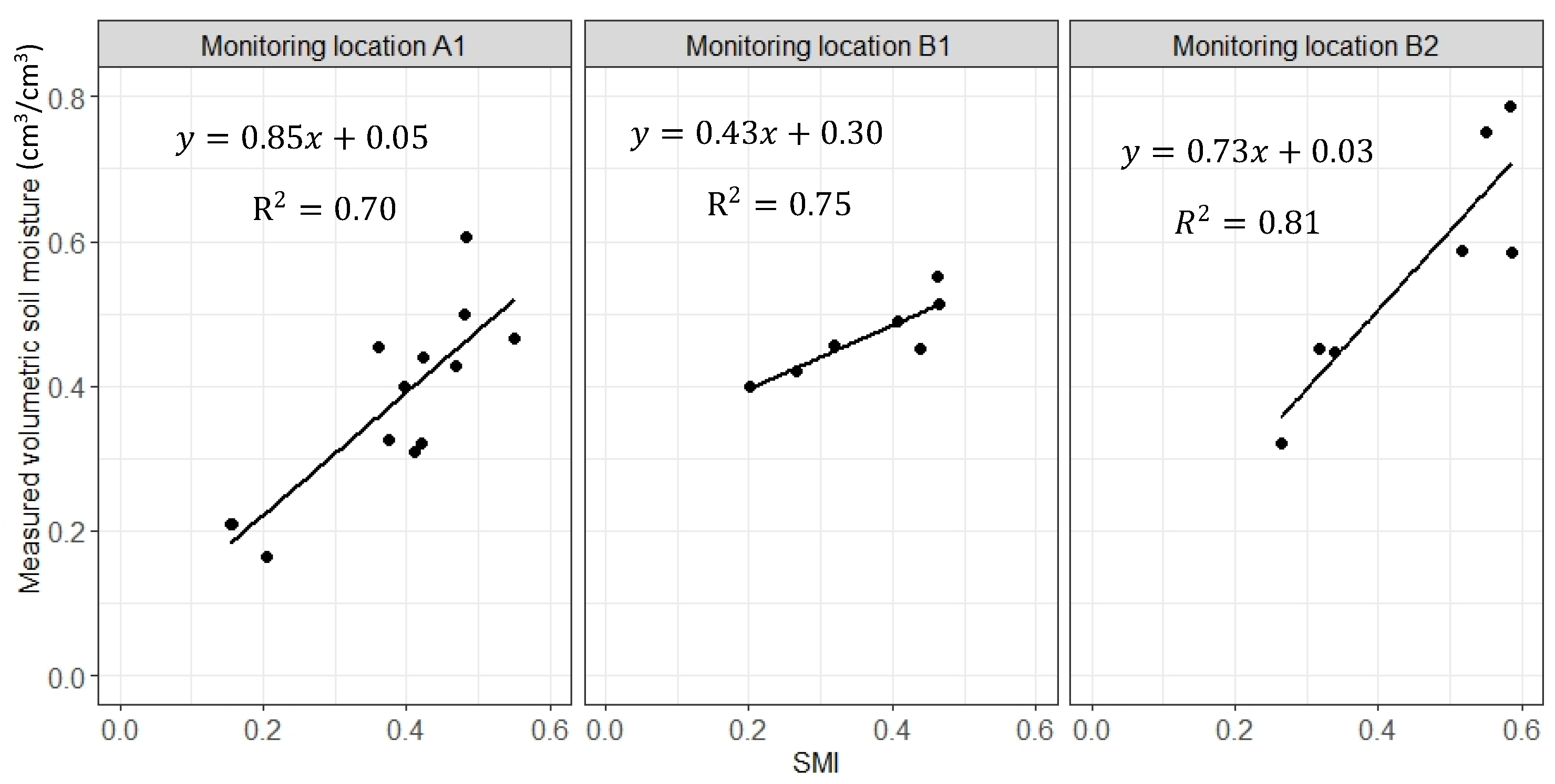 Correlation between the calculated Soil Moisture Index (SMI) values and measured volumetric moisture contents of the topsoil of the studied sites.