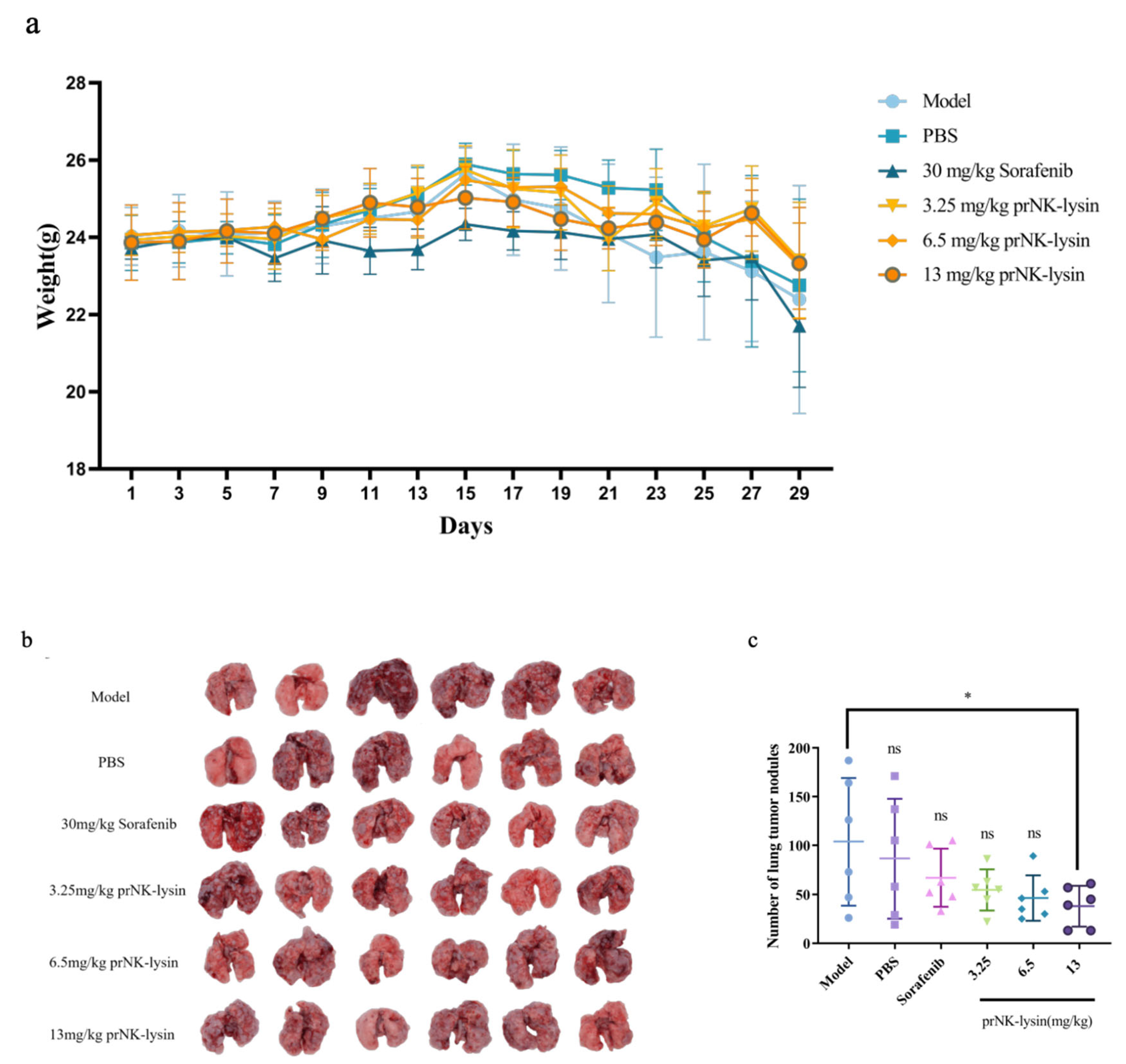 Figure 5a, the body weight showed no significant difference between all of groups. The lung tissues of mice were taken and the number of tumor nodules were counted. The number of tumor nodules in the PBS group, the Sorafenib group, the 3.25mg/kg, 6.5mg/kg and 13mg/kg prNK-lysin group were less than the model group, but there were no statistically significant differences between the groups except 13mg/kg prNK-lysin group (