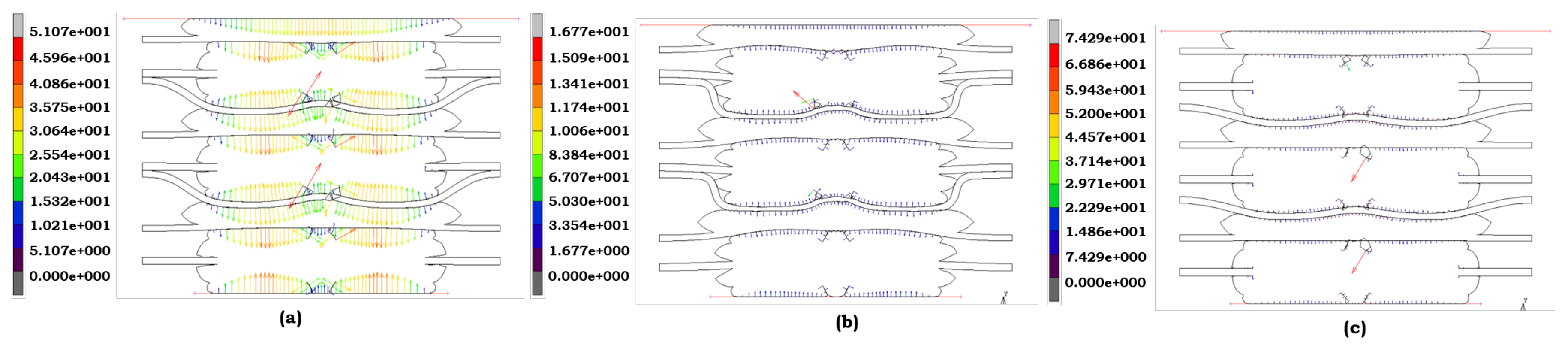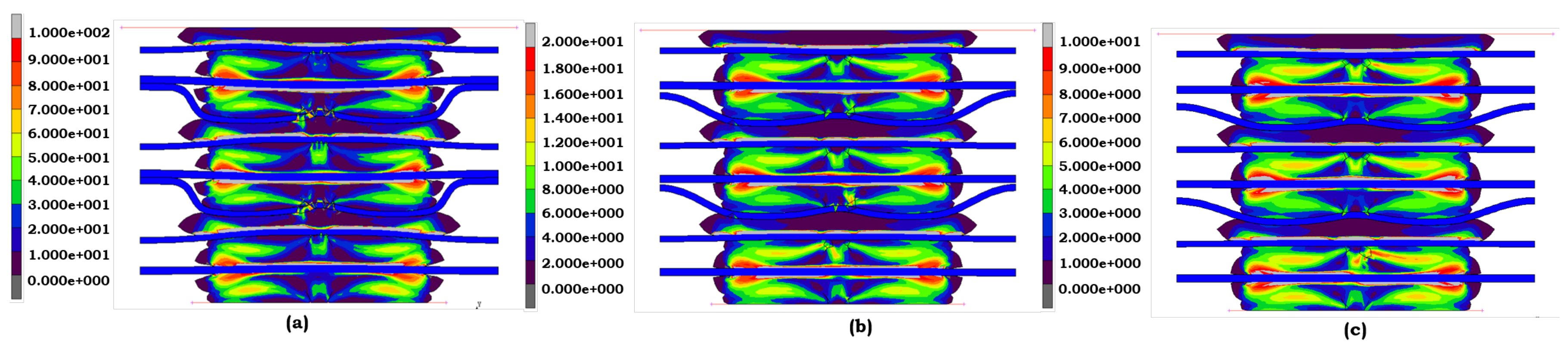 Figure 7c) provides the most precise representation of stress behavior. The material undergoes significant deformation, and the Yeoh model’s capacity to capture large strains accurately represents the severe fatigue and degradation of LSR under extreme conditions.