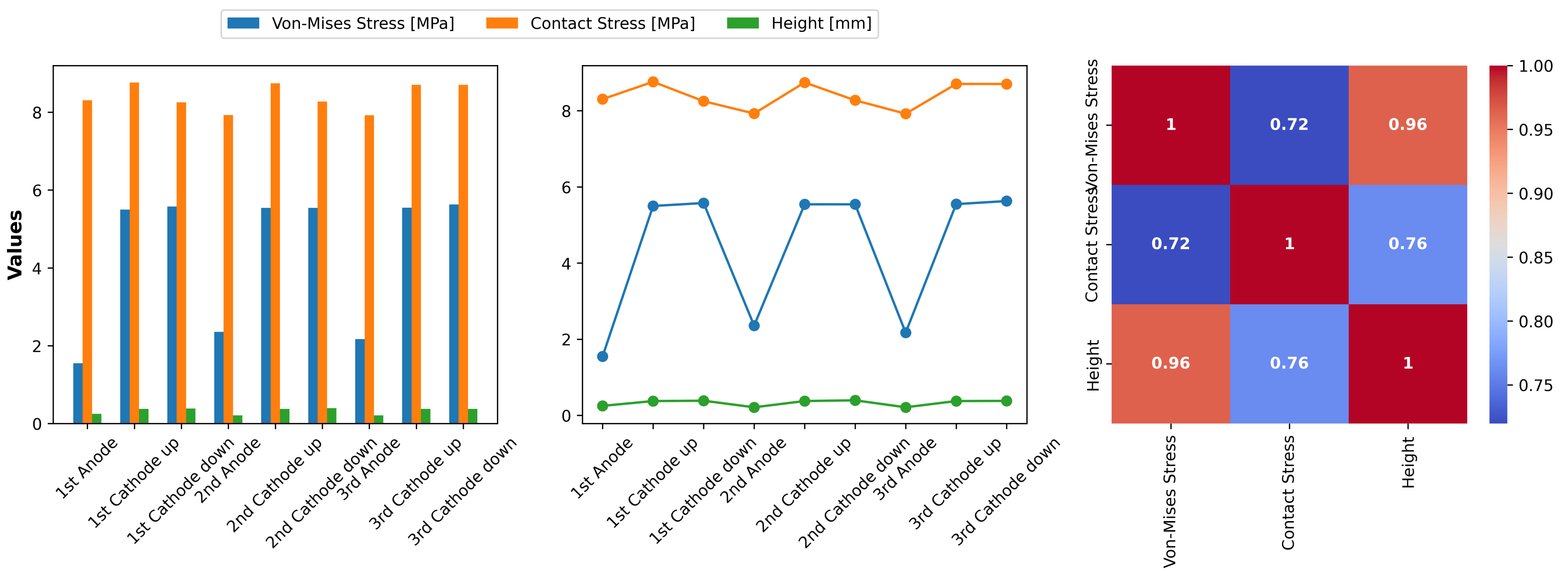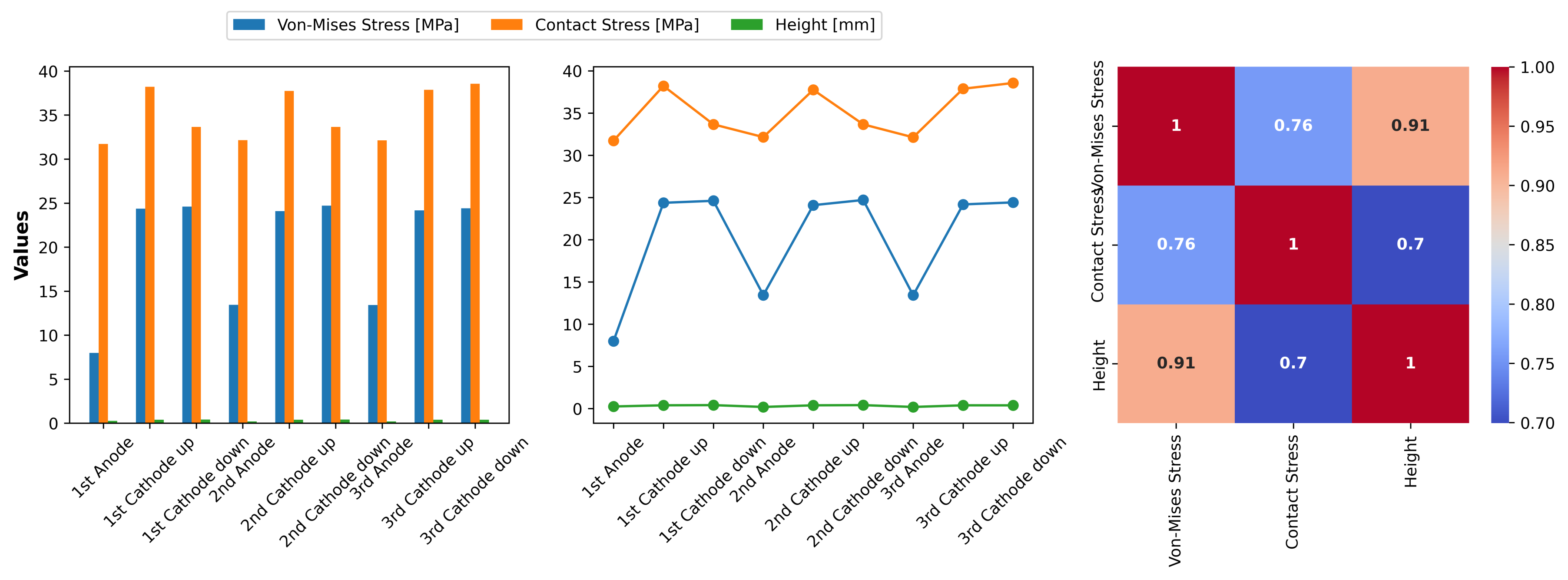 Figure A1). Here, we observe baseline stress levels across all tested locations, with notably higher contact stress in the 1st Cathode positions, hinting at potential stress concentration zones in unaged LSR. This scenario shifts under “Heat Aging” (