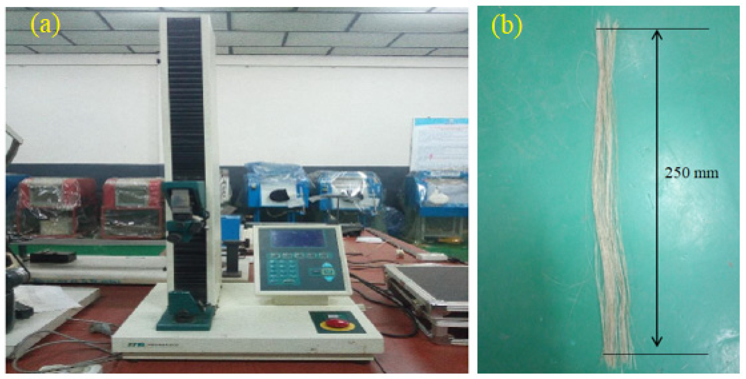Figure 2a. The universal tensile testing machine has a maximum load cell of 5 KN, a 100mm/min speed at the time of testing, and a 50mm/min speed at which to return to the original position. The tested samples are seven single fibers with 250mm long as per the ASTM D3379-75 standard as shown in