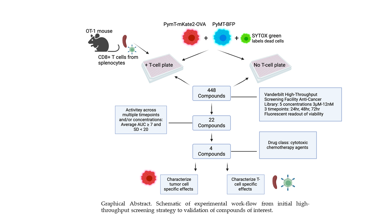 https://medschool.vanderbilt.edu/hts/compound-management/) were resuspended in SYTOX green (Invitrogen, Cat. #S7020) then individually aliquoted to each well of tumor cells. The SYTOX green dye is taken up by dead cells. Compounds were tested across a range of 5 concentrations: 3µM, 0.8µM, 0.2µM, 50nM, and 12nM. Immediately following the addition of compounds, either 500 pre-stimulated OT-1 CD8+ T-cells in 10uL DMEM or 10uL DMEM without T-cells was added per well. Whole-well images (4X) were acquired at 24hr, 48hr, 72hr treatment timepoints using the MetaXpress imaging system. Fluorescent imaging at each timepoint was used to assess cell viability in response to treatments in the presence or absence of T-cells. ImageXpress software was used to analyze images and score live/dead PyMT-mKate2-OVA cells versus live/dead PyMT-BFP cells.