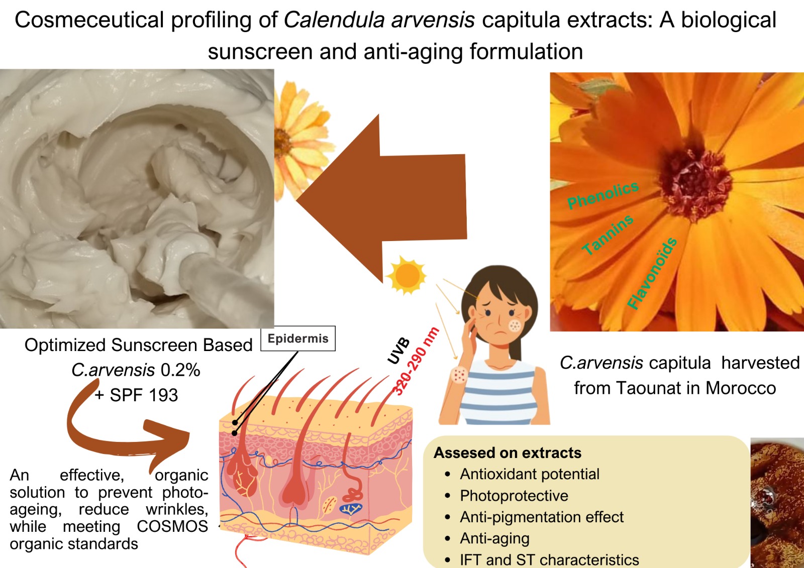 Currently, numerous cosmetic and pharmaceutical products based on Calendula species, in particular C. officinalis, have been introduced to the market in a wide range of formulations and applications. In this context, our study focuses on the development of an innovative, biological anti-ageing sunscreen based on C. arvensis capitula extracts. This approach targets the bioactive properties of C. arvensis to provide effective sun protection while targeting skin ageing concerns.