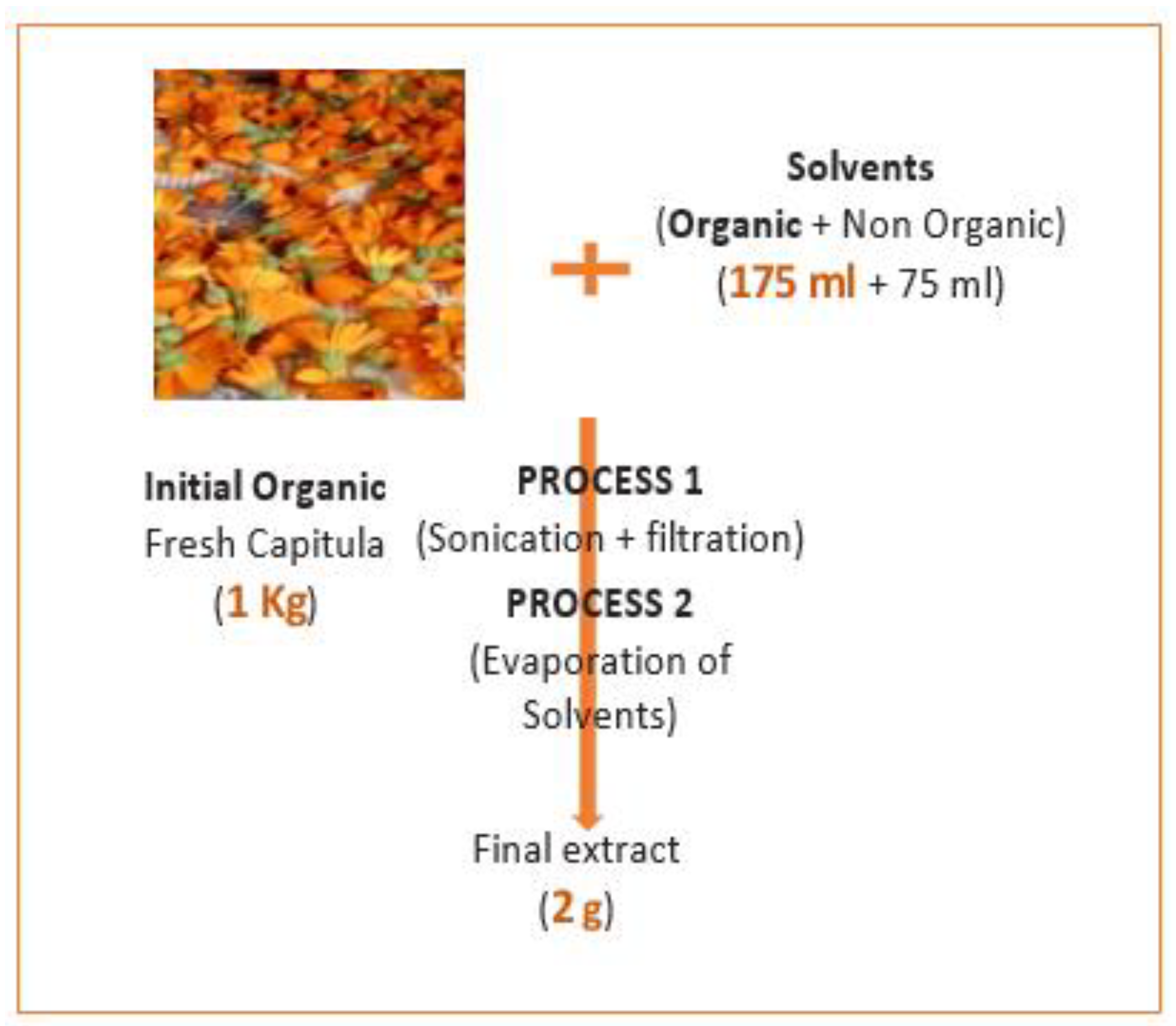 The dried capitula were ground to a particle size of 300 µm using a mechanical grinder (Industriestrasse 855743 Idar-Oberstein, Germany). The resulting powder was subjected to extraction through three distinct methods, utilizing solvents of varying polarities. Maceration was performed over 24 hours with a solid-to-solvent ratio of 1:10 (w/v). Sonication was conducted for 45 minutes with the same ratio, using either absolute ethanol or a 70%-30% ethanol-water mixture. Additionally, an infusion method was applied, where 2.5 g of the powder was infused in 75 mL of water for 1 hour. The resulting organic entities were filtered on Whatman No. 1 filter paper, then centrifuged at 3,000 rpm over a 10-minute period. The crude extracts obtained were then stored in the refrigerator until further use. The percentage extraction yield (w/w) is shown in