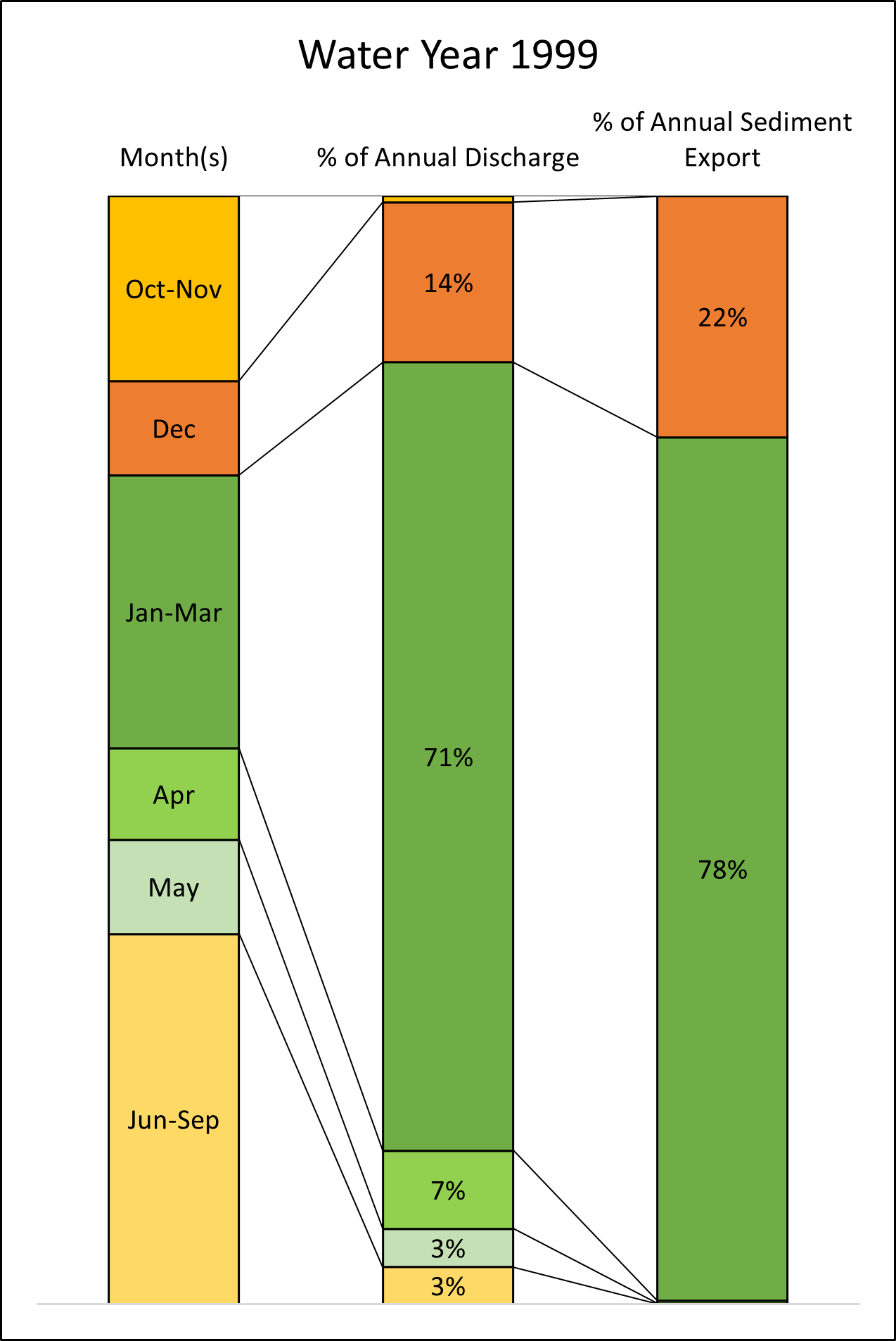 Streamflow, precipitation, and sediment loads recorded for the periods of January 18th to April 30th and March 1st to May 31st for the water years of 1999, 2000, 2001, and 2018.
