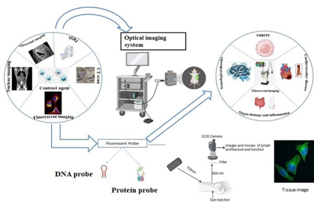 1] and the term optical imaging refers to the variety of the methods that visualize tissue optical properties by light absorption, scattering and fluorescence emission using UV to NIR light and Numerous optical disease detection probes have been developed and assessed for their ability to generate disease-specific optical signals in the tissue. They include a variety of biocompatible probes made from cyanine dyes, tetrapyyroles, lanthanide chelates, and other substances. Other probes are being developed based on the target and are target-specific, which is most useful for diagnostic purposes. These non-invasive techniques are crucial for the future.[
