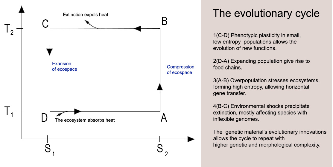 - ), and low and high entropy ( The evolutionary innovations in the genetic material allow the cycle to repeat with higher genetic and morphological complexity.