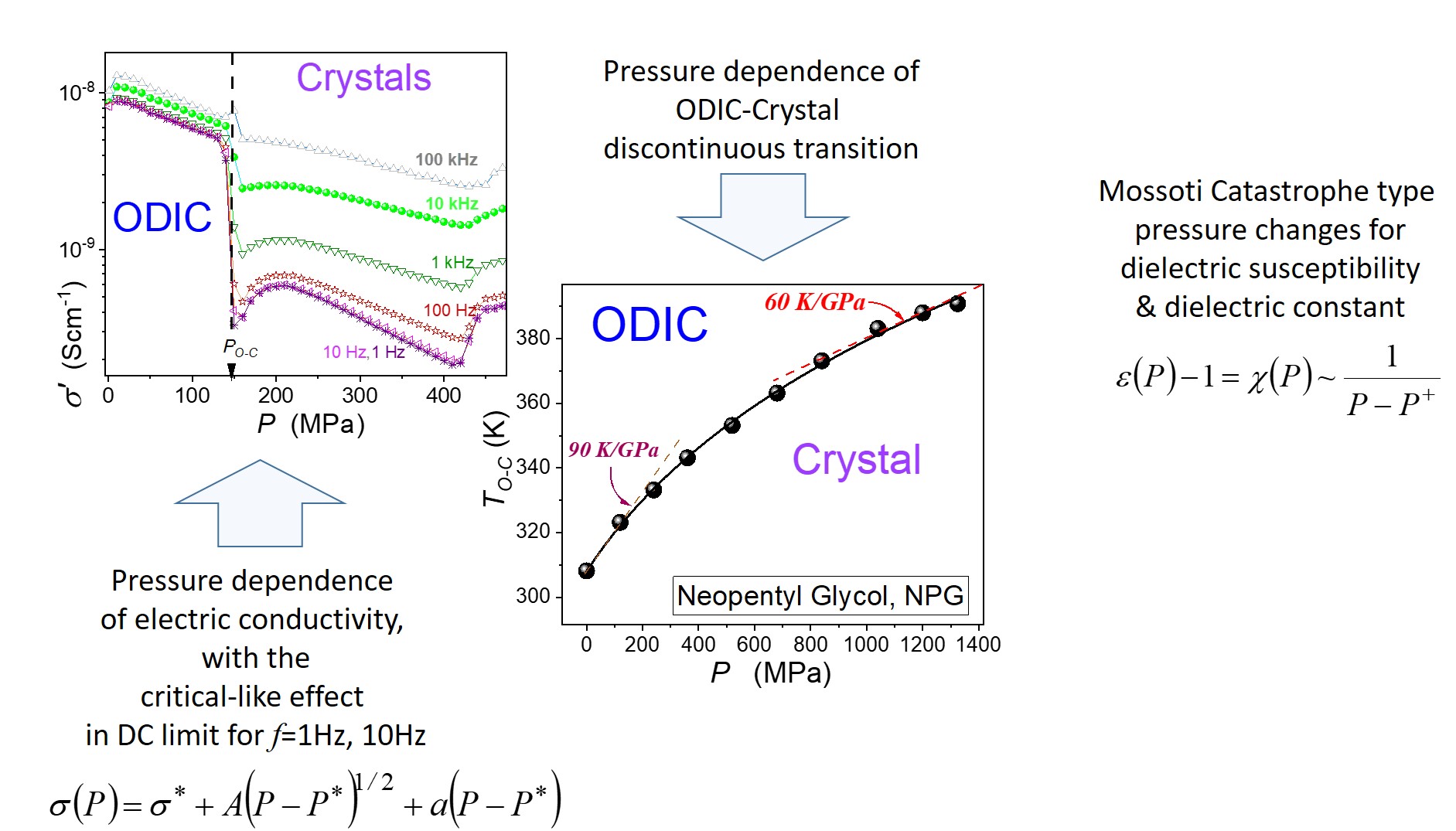 This report shows the first multi-aspect broadband dielectric spectroscopy insight for neopentyl glycol (NPG) on compressing, in the broad surrounding of the discontinuous phase transition between the ‘soft’ ODIC’ phase and the ‘hard’ crystal phase. The report introduce new evidences regarding properties of the ODIC mesophase, the ODIC- crystal or even melting/freezing discontinuous phase transition, and the colossal barocaloric effect in NPG and related materials [