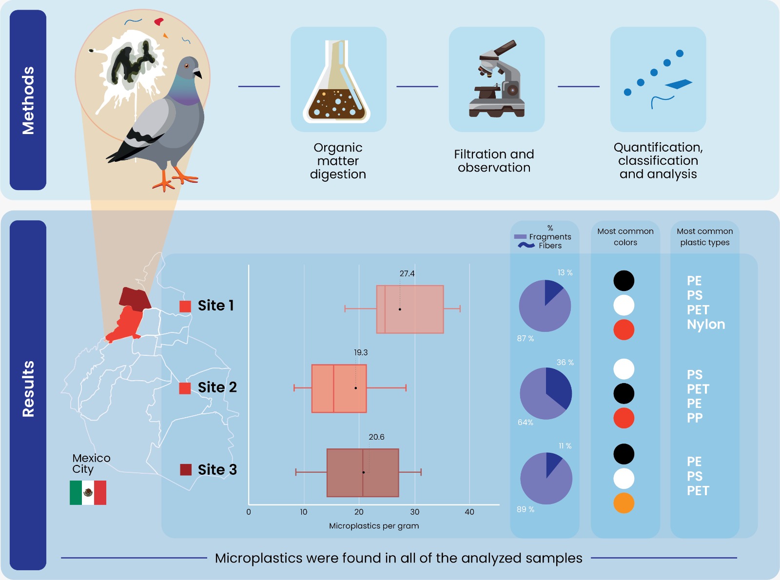 In this context, the present study aimed to develop and apply an efficient methodology to assess the presence of MPs in the feces of urban pigeons (Columba livia) from three representative sites in Mexico City. By doing so, this research seeks to enhance our understanding of plastic pollution in urban environments, identify potential MP sources, and evaluate the utility of urban birds as bioindicators of this contamination.