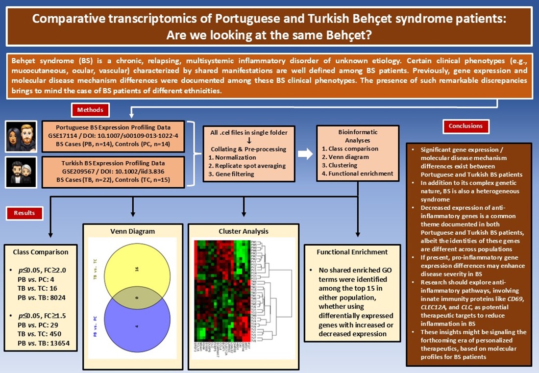 This study sought to investigate the molecular immunopathogenetic similarities and differences underlying BS across two different ethnic populations, Portuguese and Turkish. As Oguz et al.’s two previous studies pointed to the potential pathogenetic role of certain innate immunity genes (i.e., CD69, CLEC12A, CLC, and IFI27) in BS, specific focus was on BS’s fundamental innate immunity pathology [11,12]. Our main findings highlighted significant gene expression and molecular disease mechanism differences between Portuguese and Turkish BS patients, particularly regarding the anti-inflammatory and the pro-inflammatory genes. As the authors we comment that, the anti-inflammatory and the pro-inflammatory genes are the key to understand the immunopathogenesis of BS [12] and the documented expression differences in this study among the two different ethnicities may account for the observed discordant, sometimes paradoxical immunological findings present in BS studies and also the divergent clinical phenotypes of the syndrome observed in different geographic regions. Additionally, the distinct DEGs and the different molecular mechanisms observed across ethnicities, reinforces the concept of BS as a syndrome rather than a single disease entity.