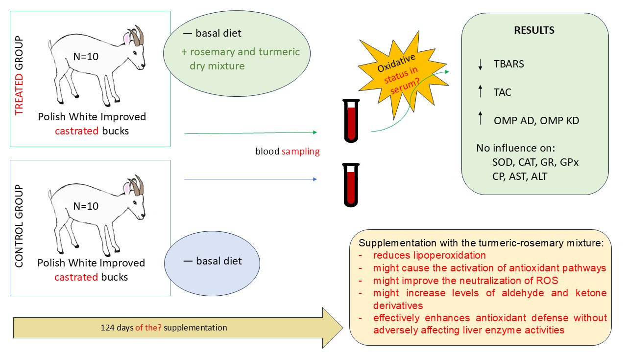 The aim of the study is the determine the effect of the turmeric-rosemary extract on various aspects of the antioxidant status of the blood of young PWI bucks: 1) the levels of lipid peroxidation and oxidative modification of proteins (OMPs) in the serum; 2) blood total antioxidant capacity (TAC); 3) antioxidant enzyme activity, viz. superoxide dismutase (SOD), catalase (CAT), glutathione peroxidase (GPx) and glutathione reductase (GR); 4) measurement of selected biochemical parameters including alanine- (ALT) and aspartate (AST) aminotransferase activities and ceruloplasmin (CP) levels. These enzymes and parameters are essential for understanding the body’s defense mechanisms in response to oxidative stress.