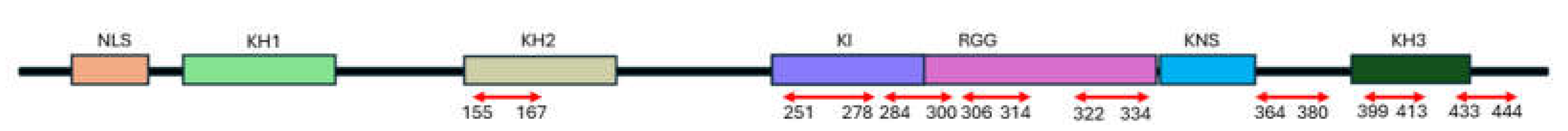 - Backe, P.H.; Messias, A.C.; Ravelli, R.B.; Sattler, M.; Cusack, S. X-Ray Crystallographic and NMR Studies of the Third KH Domain of hnRNP K in Complex with Single-Stranded Nucleic Acids. Structure 2005, 13, 1055–1067. [Google Scholar] [CrossRef] [PubMed]