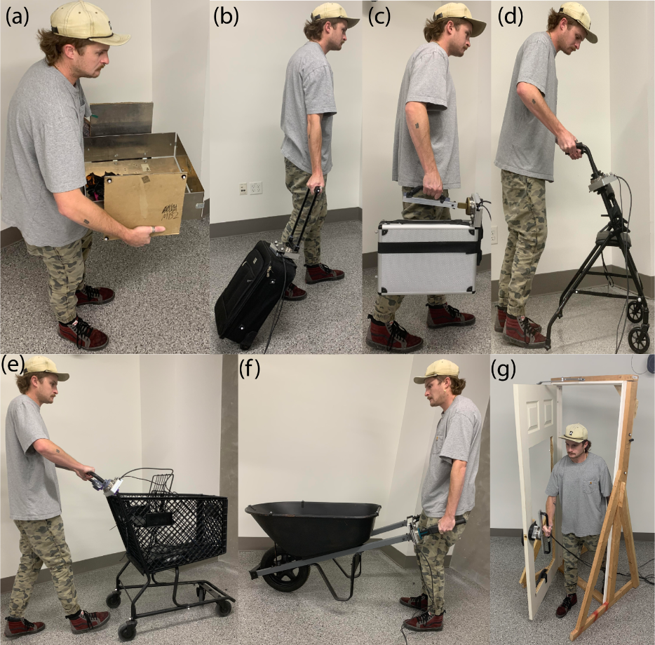 17] use an XSens MVN with sparse IMUs to measure human kinematics during activities of daily life on a university campus, driving, going to a variety of different stores, working in a machine shop and laboratory, exercising, and at home. This generated a large data set across 13 subjects, which was then used to train deep learning networks to predict upper body motion and full body motion. While some of the activities, such as walking up to a door and opening it, pushing a cart, or lifting a box, are like those in our study, they only focus on the kinematics of the human whereas the database presented here also characterizes kinetic interaction with the object and its resulting motion.