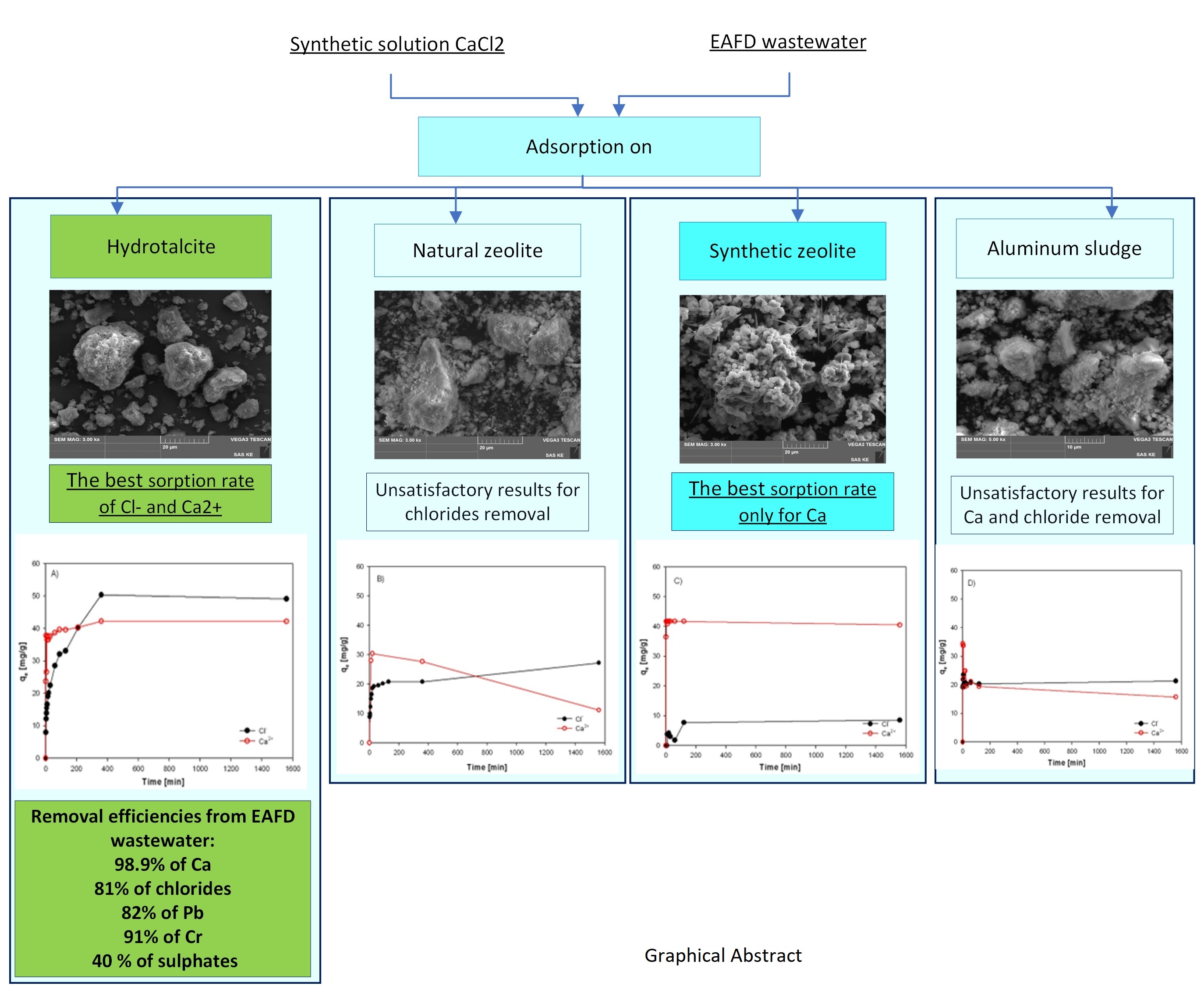In order to compare the sorption behaviour of four different sorbents, a synthetic solution and real wastewater (EAFD wastewater) were used. The sorbents from different sources (laboratory synthetized Hydrotalcite, natural zeolite - Clinoptilolite, laboratory synthetized zeolite from waste, and waste Alumina sludge) were characterized. Then it was investigated the sorption capacity of the sorbents and the efficiency of the removal of Cl- and Ca2+ ions in the absence and presence of other ions. The aim of the study was to determine and select a prospective sorbent which is most effective and sustainable in the simultaneous removal of chlorides and calcium from industrial wastewater (alkaline).