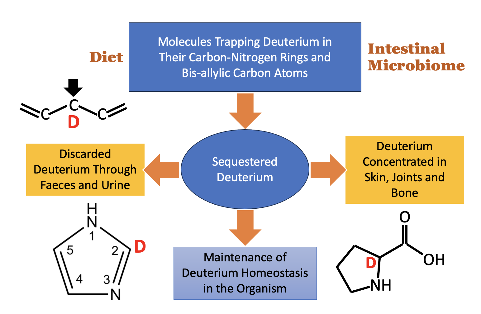 We have identified a small number of nitrogen-carbon ring structures and other molecular configurations of carbon atoms that appear to be unique in their ability to trap and retain deuterium. In many cases, once a molecule containing one of these special structures traps a deuterium atom, certain enzymatic reactions are greatly suppressed, because the enzyme that catalyzes the reaction has a very high deuterium KIE. Many of these molecules are excreted into the faeces or the urine, because they are unable to be further metabolized. It has occurred to us that the unique properties of these organic molecules may play an essential role in maintaining low deuterium levels in biological water, something that is likely to be very important in the gut lumen. A small molecule with a single deuterium atom has a much higher concentration of deuterium than there is in water, where one out of every 6000 protons is a deuteron. Essentially, these molecules can be seen as finding and defusing deuterium “land mines.”