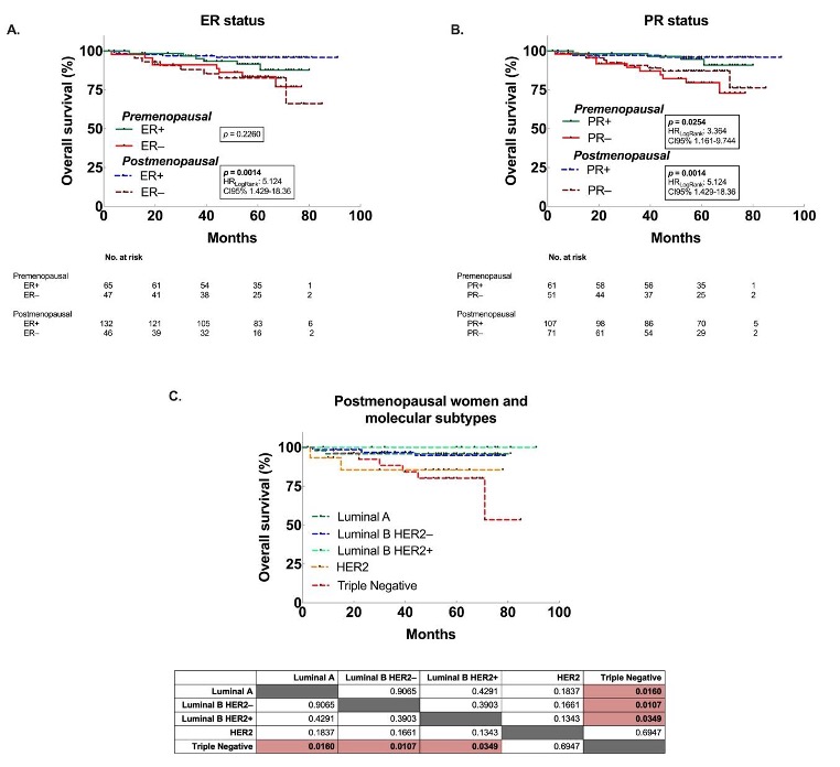 | 1p value calculated withMantel-Cox test (Log-Rank); OS: overall survival; HR: hazard ratio; CI: confidence interval.ER: estrogen receptors; PR: progesterone receptors. | ||||