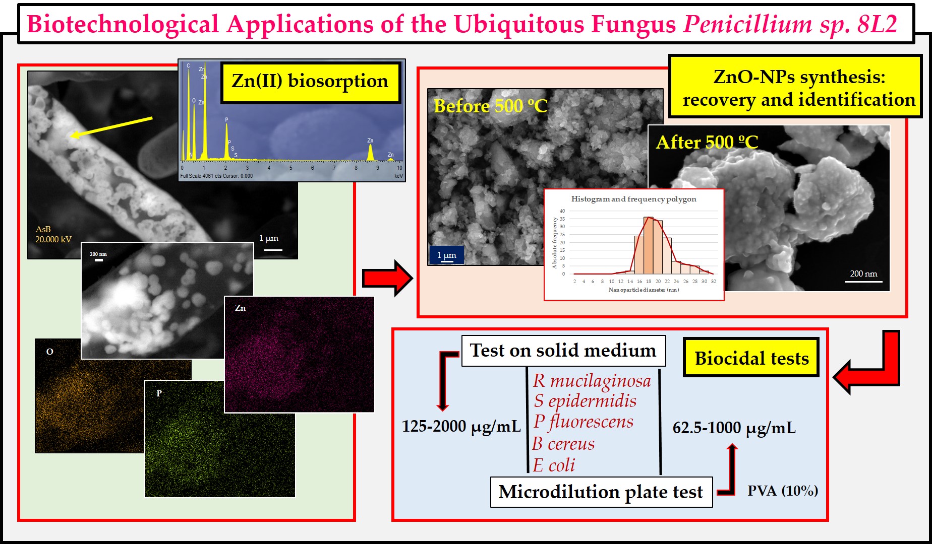 Penicillium sp. 8L2 showed good potential for biotechnological application in the field of heavy metal removal from contaminated wastewater, and also offered good potential for use in the green synthesis of ZnO-NPs. The results obtained in this work showed that the ubiquitous microorganism had a good biosorption capacity for Zn(II) (qm=52.14 mg/g) under the optimal conditions obtained by the experimental design. The novel methodology used in the FESEM-EDX analysis made it possible to identify the metal retained at the subsurface level without resorting to TEM analysis. The synthesized nanoparticles presented spherical shapes and an average size of 18 nm and exhibited high biocidal capacity against four bacteria and one yeast, with MIC values ranging from 62.5 to 1000 µg/mL. These nanoparticles were obtained by a simple method with good performance. The inclusion of a dispersing agent, PVA, improved the biocidal efficacy and indicates that the addition of different non-toxic agents can help to enhance the efficacy of the nanoparticles. In the future, this line of work should be further explored, as it may allow the reduction of nanoparticle doses while obtaining the same effect, which could be a step towards their use in in vivo applications.